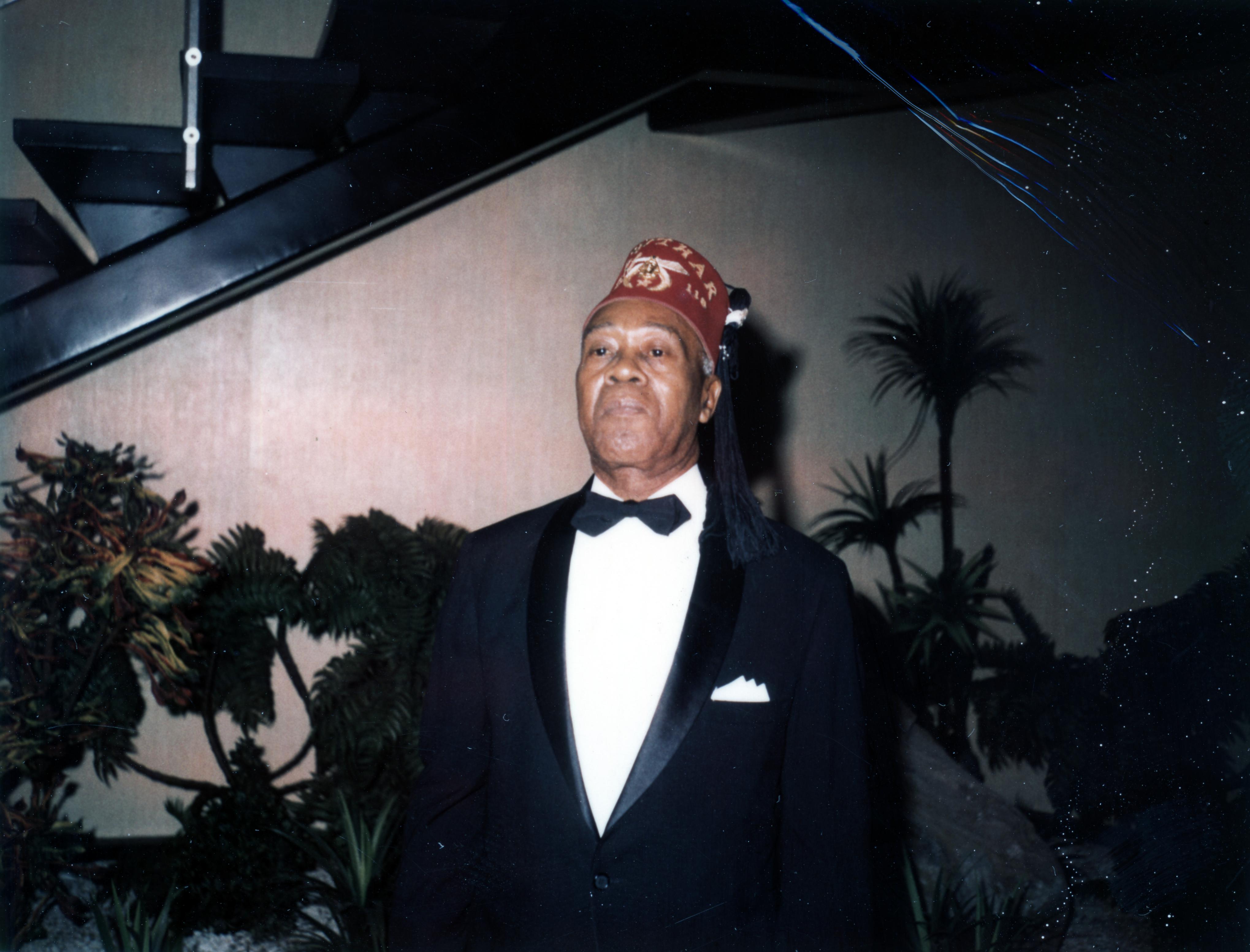 Dr. Charles E. Rochelle at Potentates Ball, wearing his fez for the Cawthar Shrine Temple. Dr. Charles E. Rochelle served as a private in the U.S. Army in World War I. After the war, he became the first African-American to receive a doctorate in education from the University of California-Berkeley. Dr. Rochelle was a social studies teacher and then principal of Lincoln High School in Evansville, IN, retiring in 1962. He served as a member of Liberty Baptist, Cawthar Shrine Temple, Deaconess Hospital Foundation Board, and was a 33rd Degree Mason.