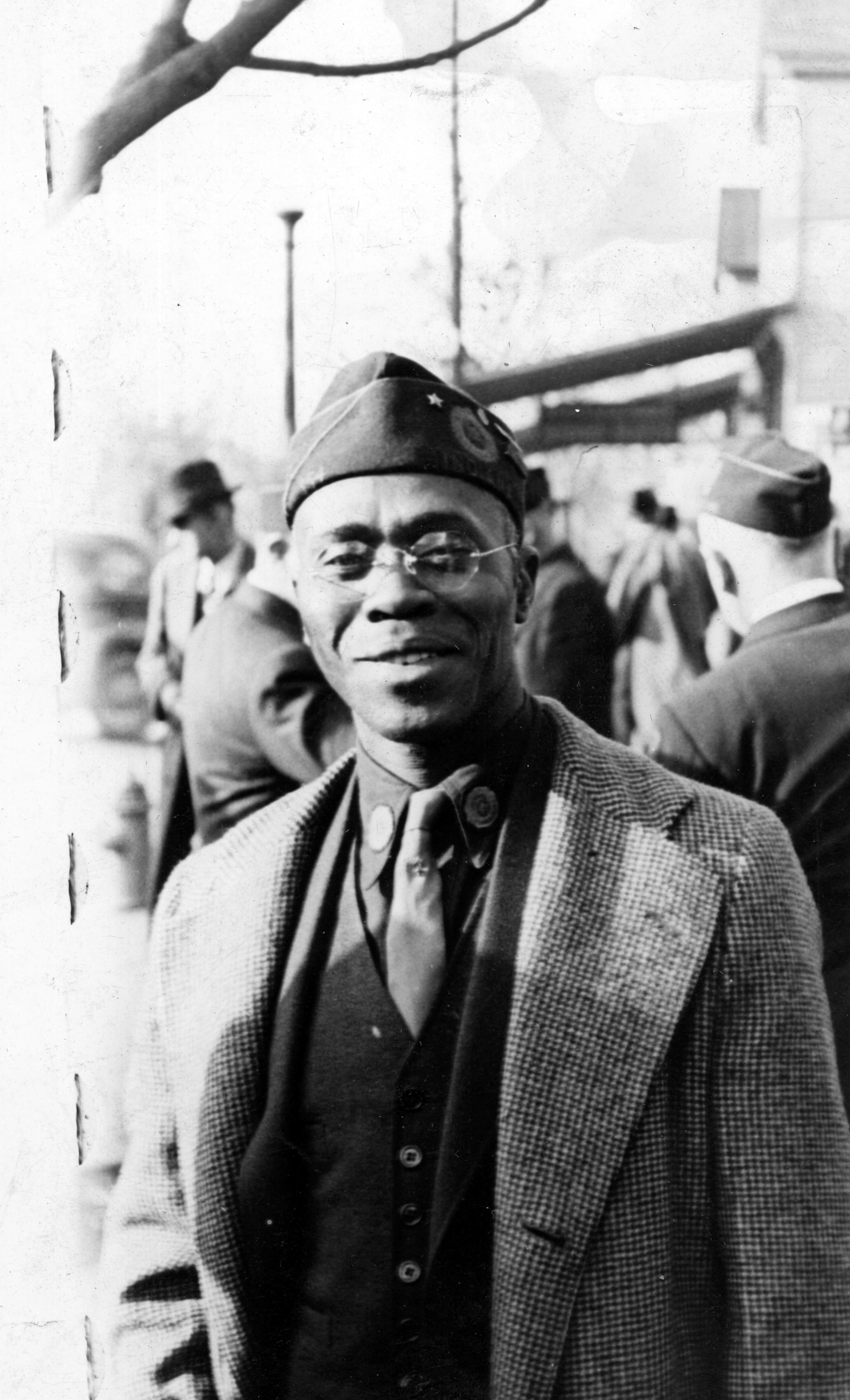 Dr. Charles E. Rochelle, wearing what appears to be a WWI military cap. A crowd of other men stand behind him, some of them also wearing this style hat. Dr. Charles E. Rochelle served as a private in the U.S. Army in World War I. After the war, he became the first African-American to receive a doctorate in education from the University of California-Berkeley. Dr. Rochelle was a social studies teacher and then principal of Lincoln High School in Evansville, IN, retiring in 1962. He served as a member of Liberty Baptist, Cawthar Shrine Temple, Deaconess Hospital Foundation Board, and was a 33rd Degree Mason.