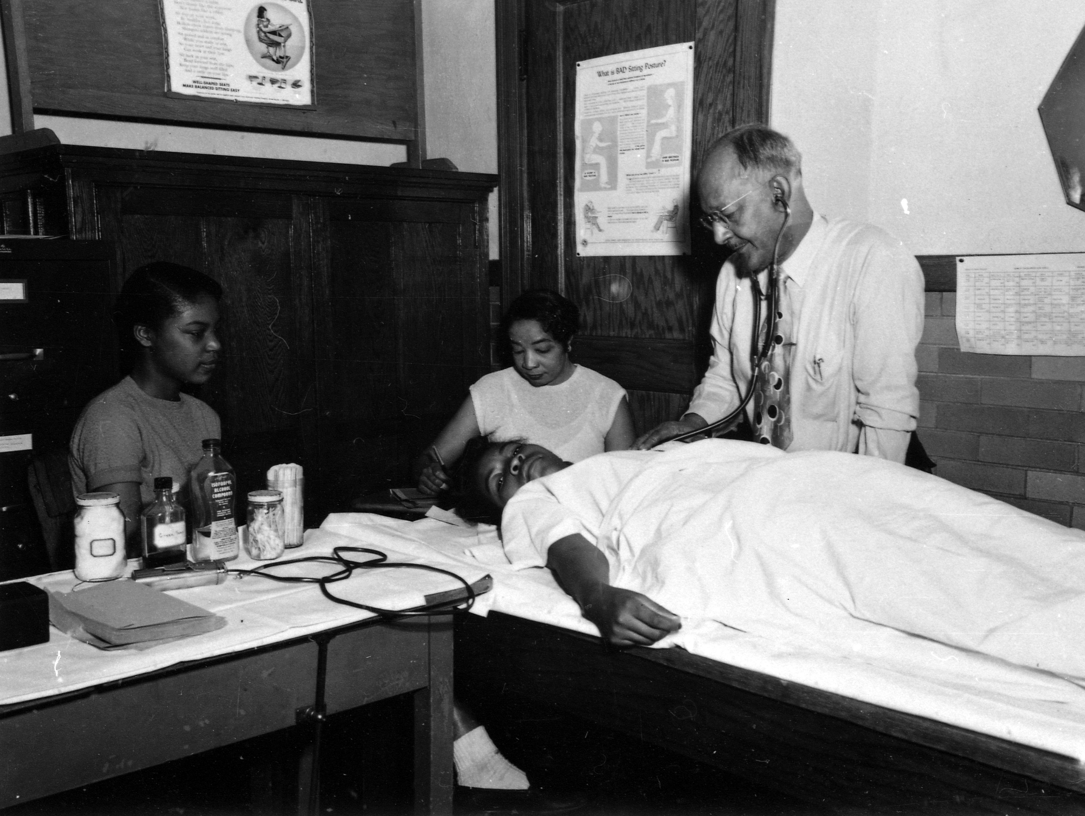 Lincoln High School student health office. The school was and is at 635 Lincoln Ave., although now it is K-8. Here a student is laying on an examining table, while the doctor listens to her heart. A woman takes notes while a girl sits nearby.