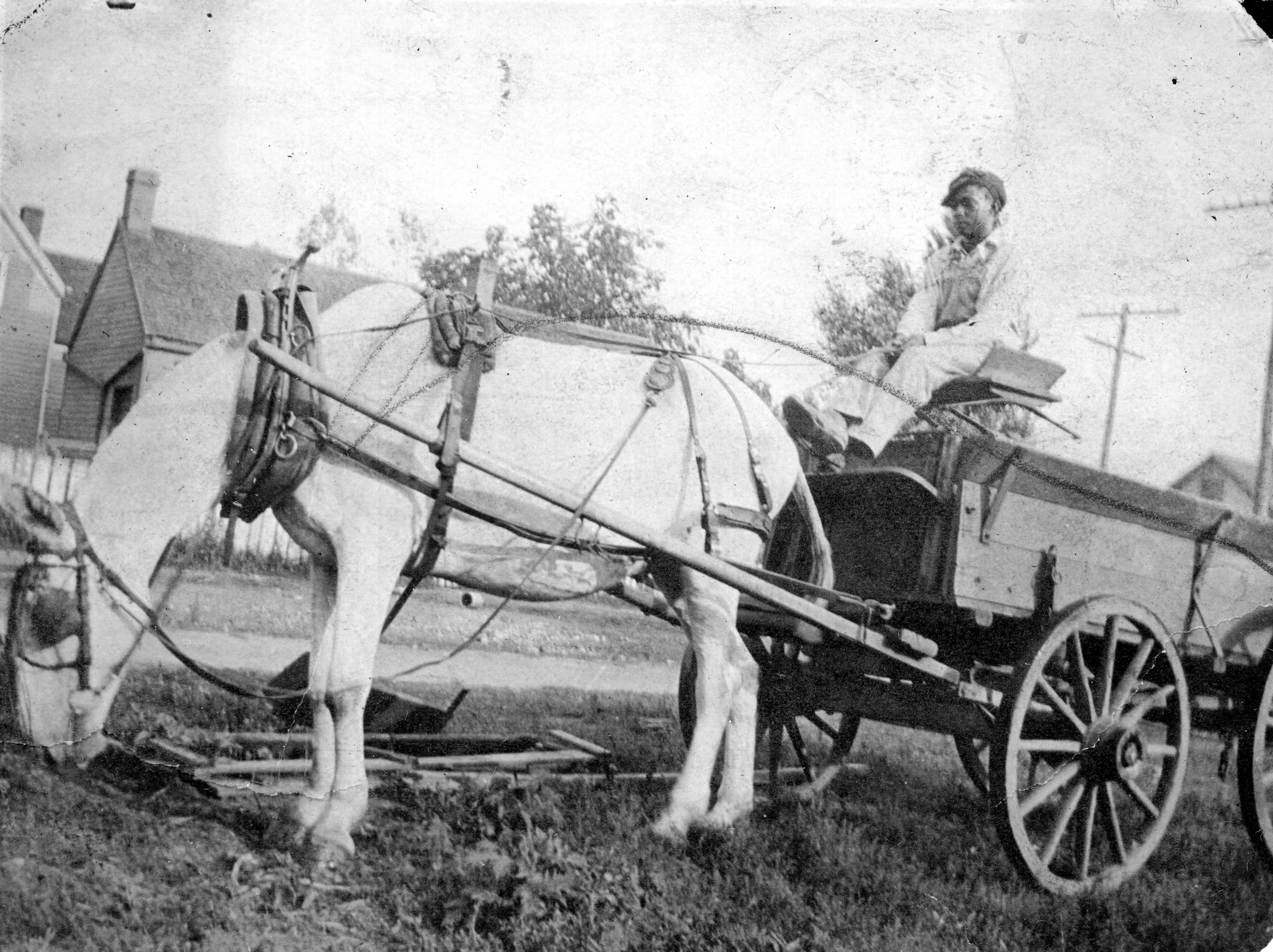 Unidentified man driving wagon pulled by a horse