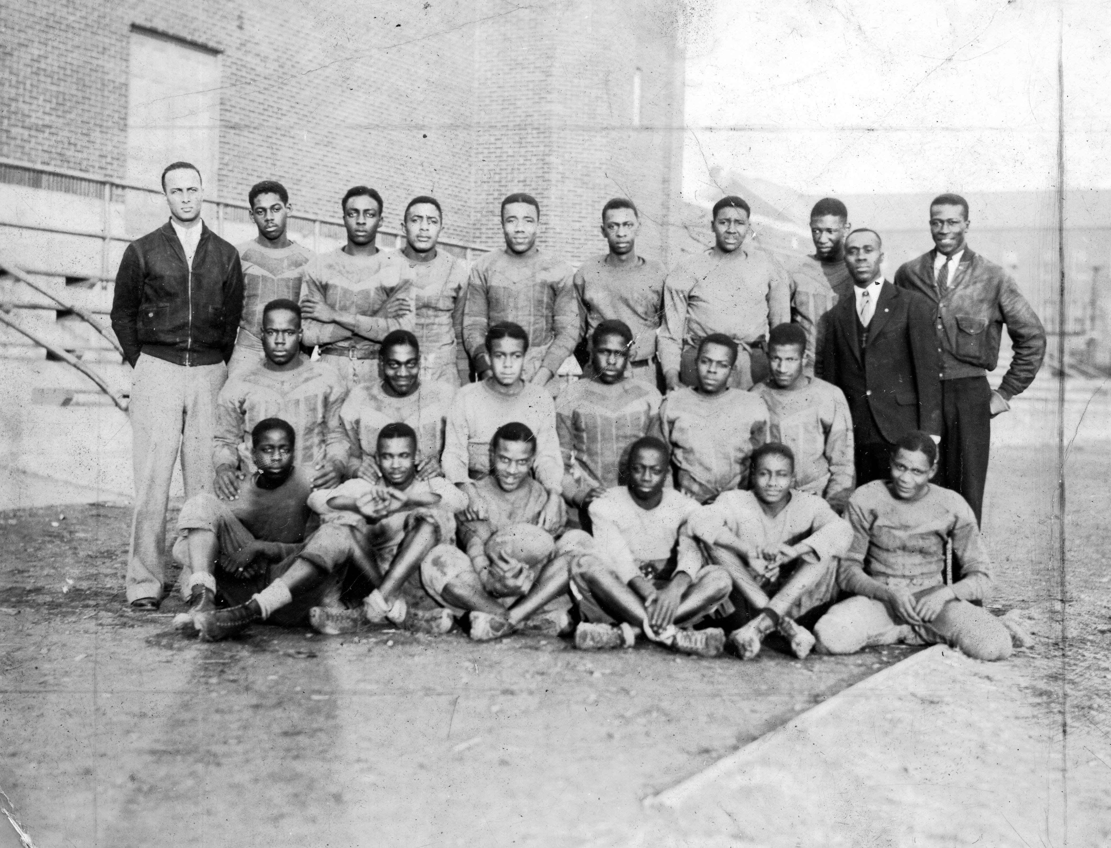 Lincoln High School basketball team, with principal Dr. Charles E. Rochelle standing second right. The school, at 635 Lincoln Ave., opened in 1928. The high school portion closed in 1962, and in 1985 it became an elementary school, as it operates today. When the school opened in 1928 it incorporated students from the previous Frederick Douglass High School. Dr. Charles E. Rochelle served as a private in the U.S. Army in World War I. After the war, he became the first African-American to receive a doctorate in education from the University of California-Berkeley. Dr. Rochelle was a social studies teacher and then principal of Lincoln High School in Evansville, IN, retiring in 1962. He served as a member of Liberty Baptist, Cawthar Shrine Temple, Deaconess Hospital Foundation Board, and was a 33rd Degree Mason.