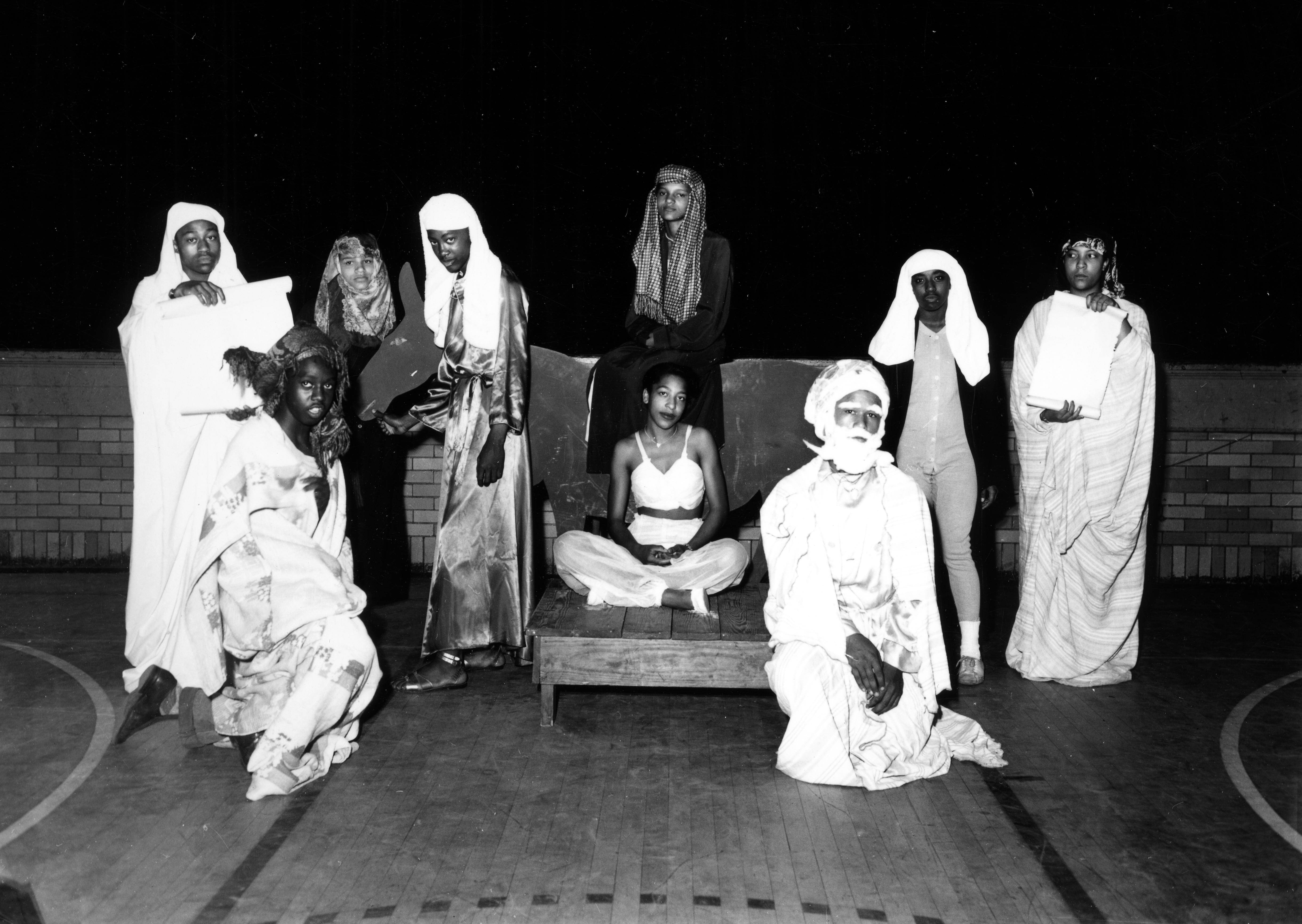 Nativity scene at Lincoln High School with this cast: Charles Reynolds, Edward Coleman, Mayme Towler, Harold Jackson, and Lorene Ryder. There was no indication who is who. The school was and is at 635 Lincoln Ave., although now it is K-8.