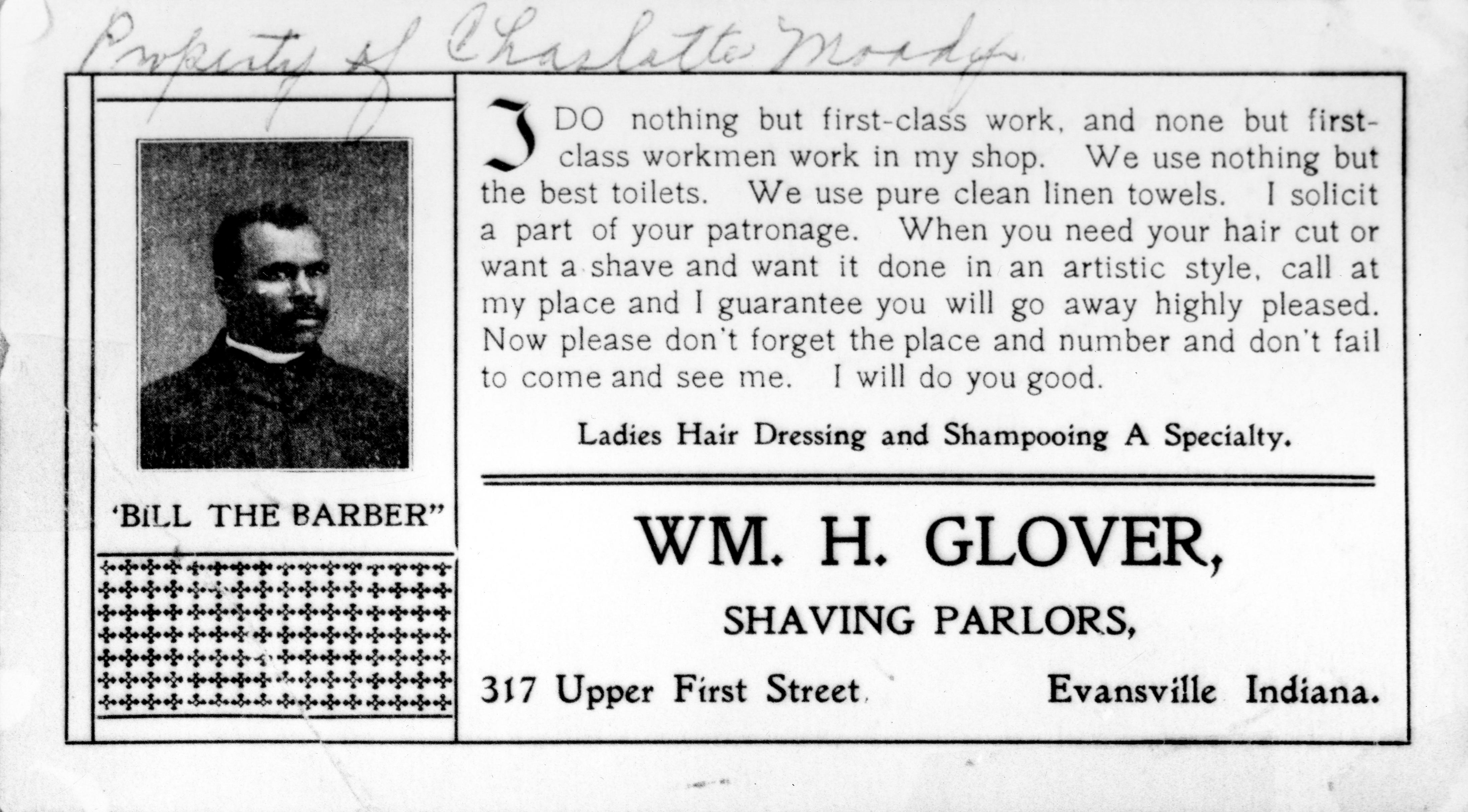 Advertisement for William H. Glover's Shaving Parlor at 317 Upper (South) First St. The text reads: ""I do nothing but first-class work, and none but first-class workmen work in my shop. We use nothing but the best toilets. We use pure clean linen towels. I solicit a part of your patronage. When you need your hair cut or want a shave and want it done in an artistic style, call at my place and I guarantee you will go away highly pleased. Now please don't forget the place and number and don't fail to come and see me. I will do you good. Ladies Hair Dressing and Shampooing a Specialty."" According to the text on p. 166 of We Ask Only a Fair Trial, this business ""was open from 1895 until 1929. Renowned for its attractive furnishings and service, the shop was a favorite among white professionals and businessmen. The shop was closed, after Glovers death, because his son chose to pursue other interests."" He died in 1929 at age 63.