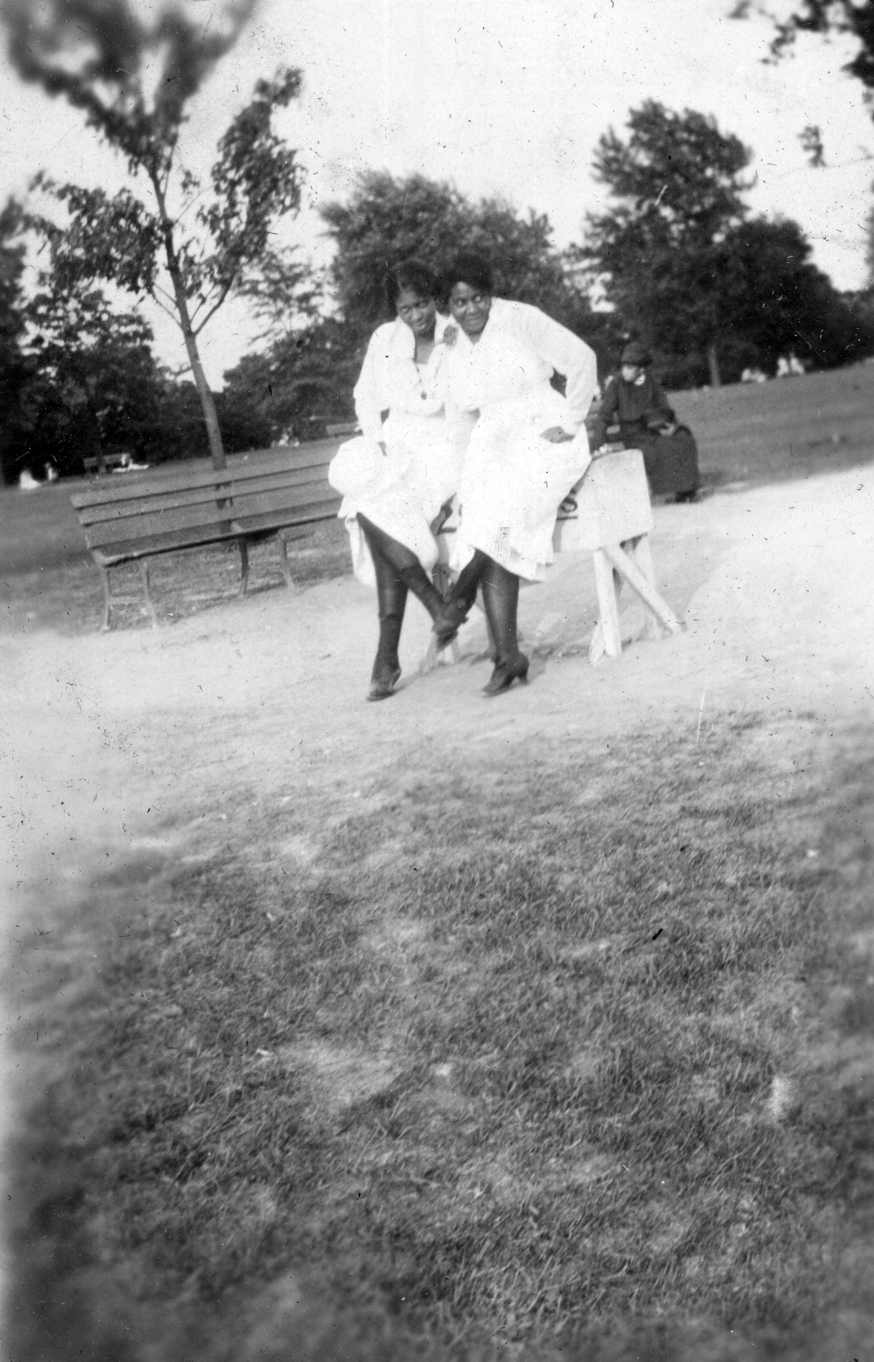 Two unidentified women, sitting on a box in the park, with their legs cross--they appear to be smiling or joking with someone off camera.