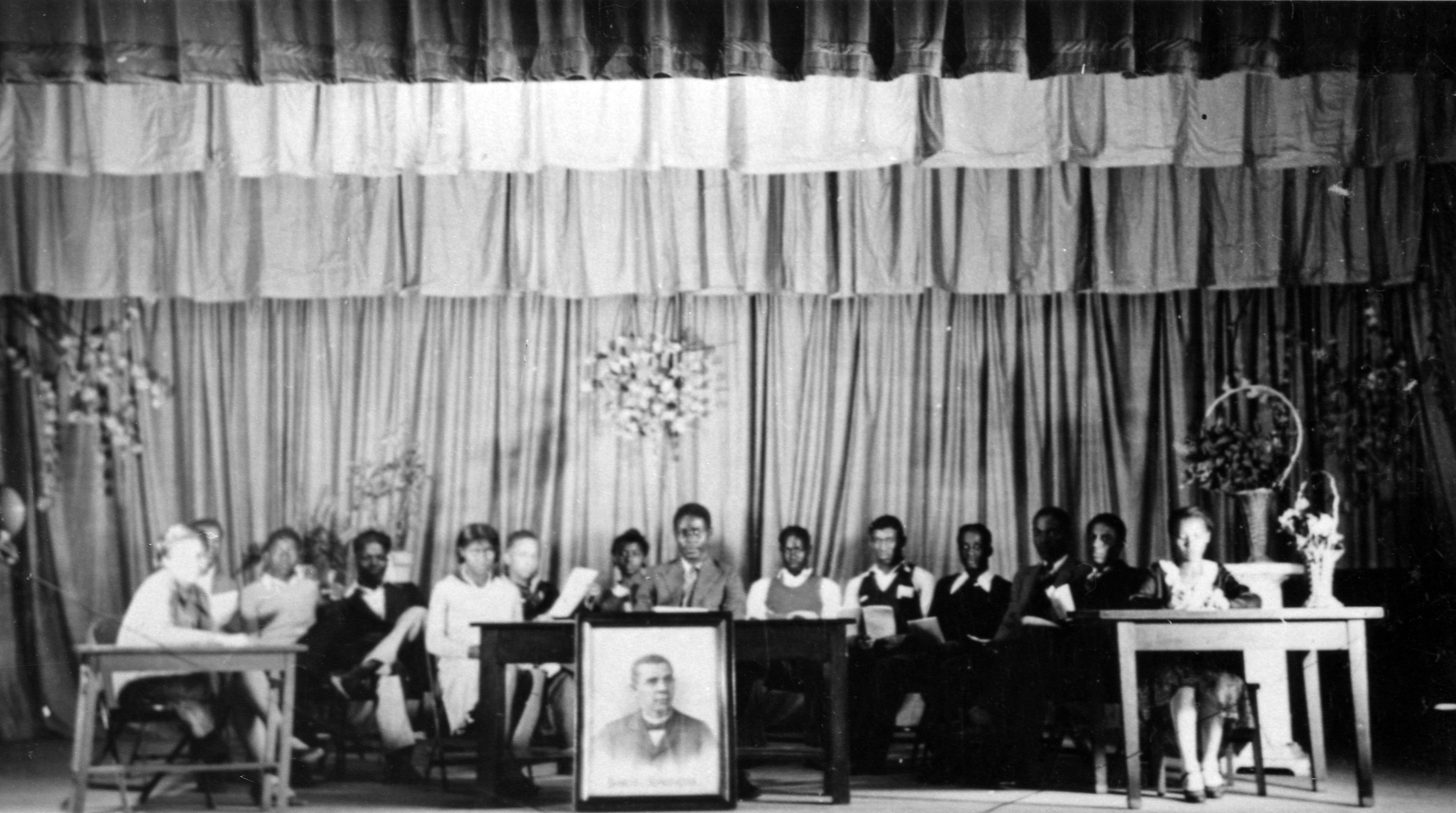 Lincoln High School students, on stage, possibly commemorating the unidentified man in the portrait in front. The school was and is at 635 Lincoln Ave., although now it is K-8.