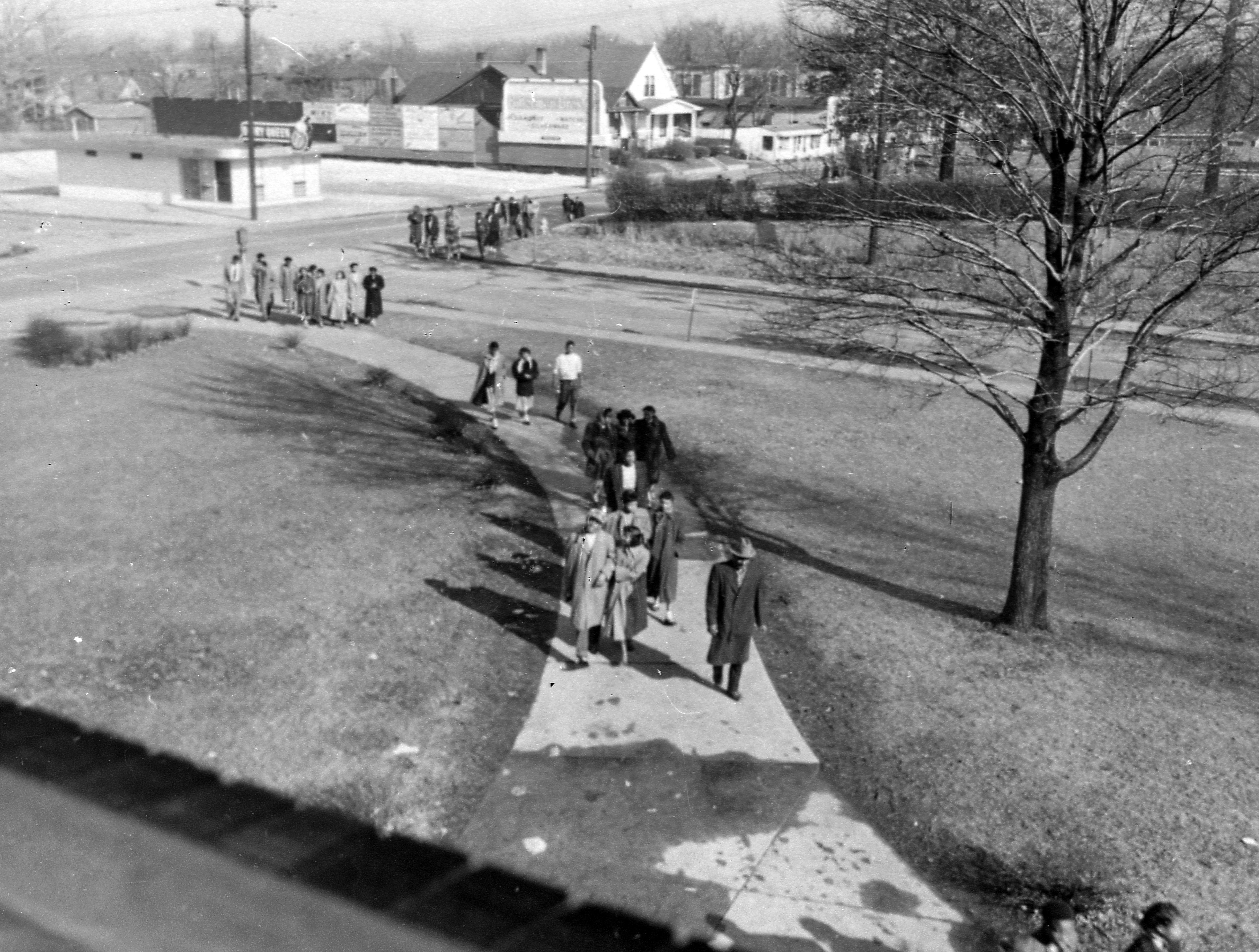 Lincoln High School students and staff walking to school. The school was and is at 635 Lincoln Ave., although now it is K-8.