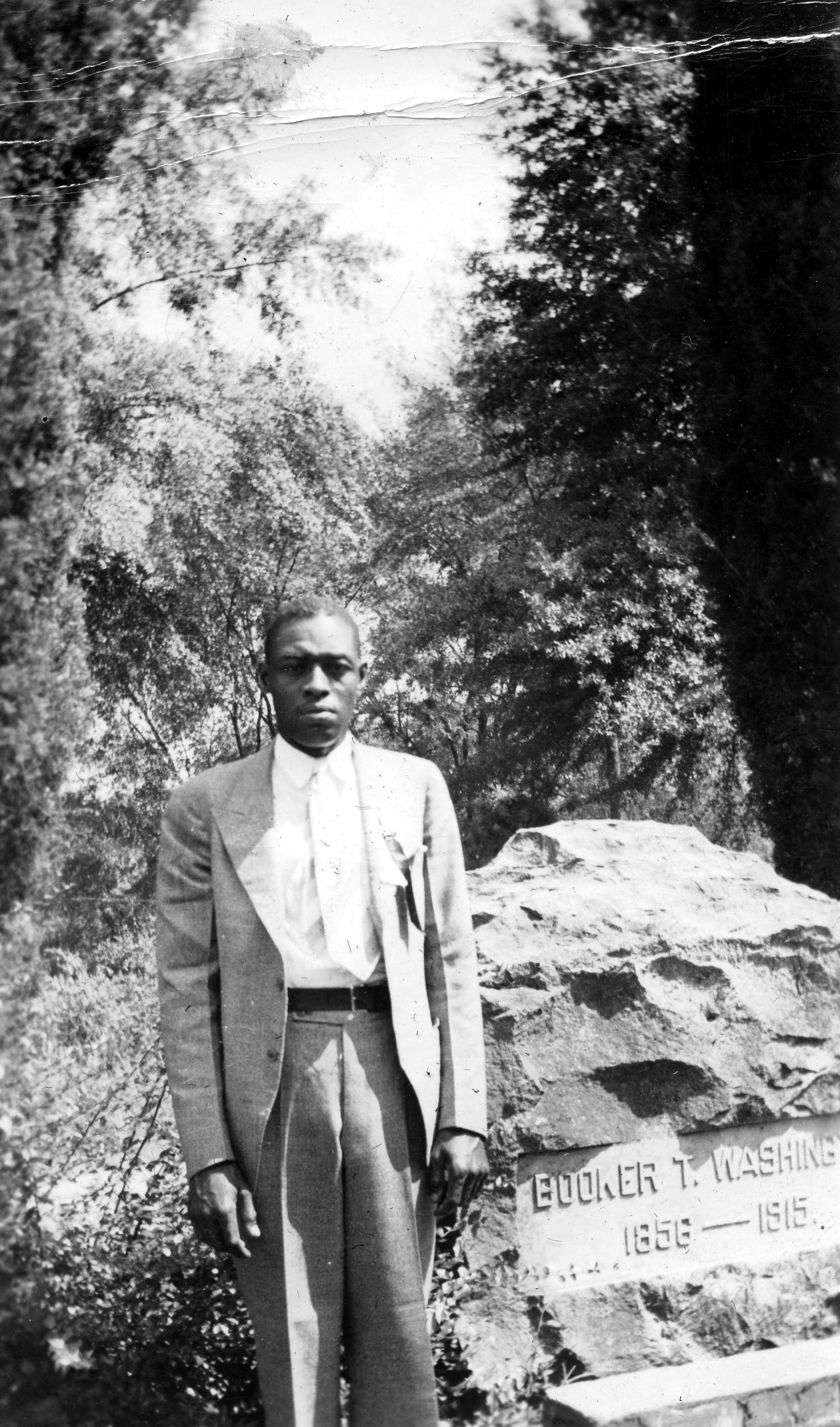 African American man wearing a suit, standing by Booker T. Washington's tombstone at Tuskegee University. Booker Taliaferro Washington was born April 5, 1856 in Hale�s Ford, Franklin County, Virginia, and died November 14, 1915 in Tuskegee, Alabama. He was an American educator, author, orator, and political leader. He founded Tuskegee Normal and Industrial Institute in Alabama (now known as Tuskegee University). From the university's website: Booker T. Washington's funeral on November 17, 1915 was held in the Tuskegee Institute Chapel, and was attended by nearly 8,000 people. He was buried on campus in a brick tomb, made by students, on a hill commanding a view of the entire campus.