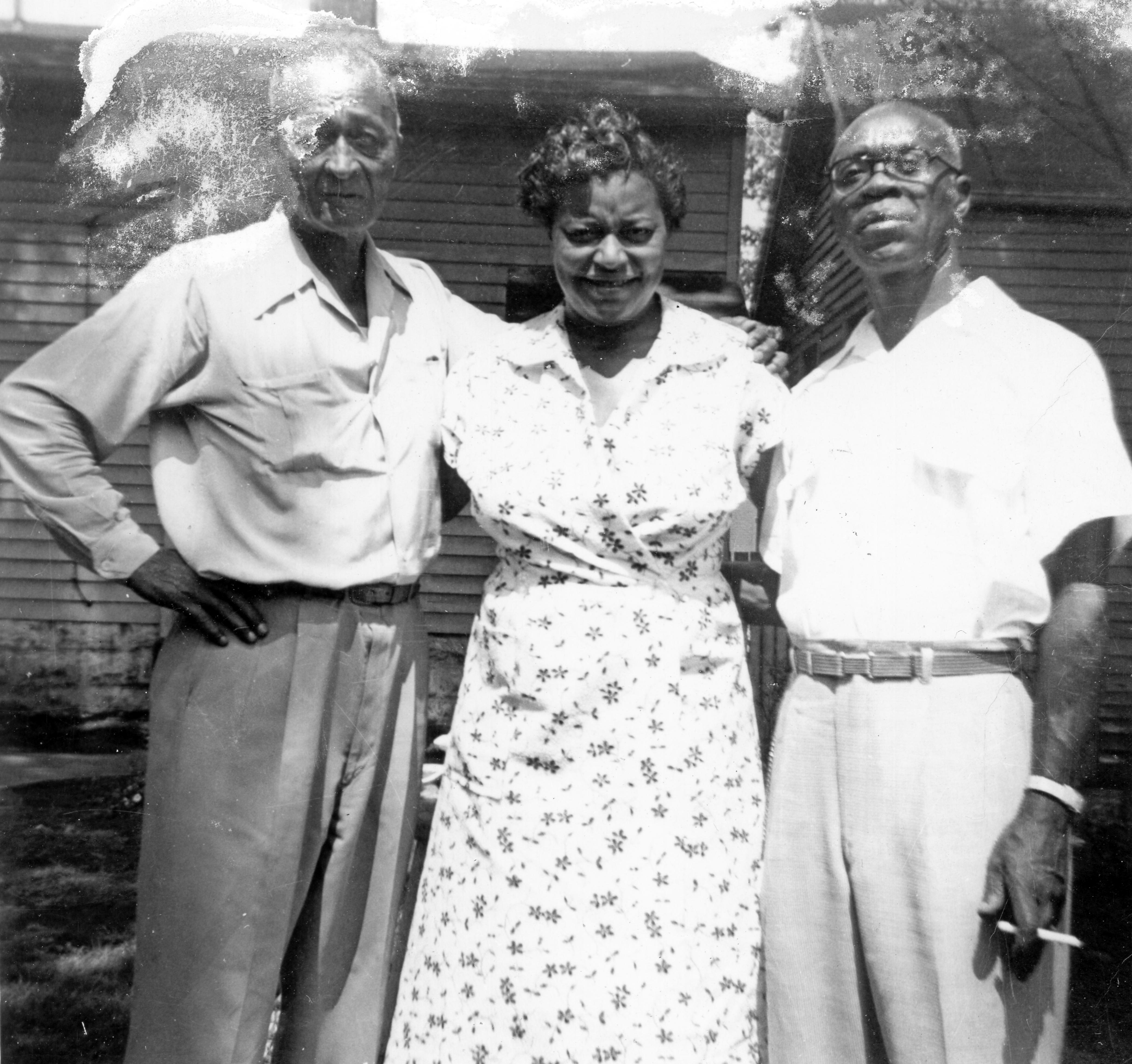Dr. Charles Rochelle (left) and unidentified man, in the backyard of a home. Dr. Charles E. Rochelle served as a private in the U.S. Army in World War I. After the war, he became the first African-American to receive a doctorate in education from the University of California-Berkeley. Dr. Rochelle was a social studies teacher and then principal of Lincoln High School in Evansville, IN, retiring in 1962. He served as a member of Liberty Baptist, Cawthar Shrine Temple, Deaconess Hospital Foundation Board, and was a 33rd Degree Mason.