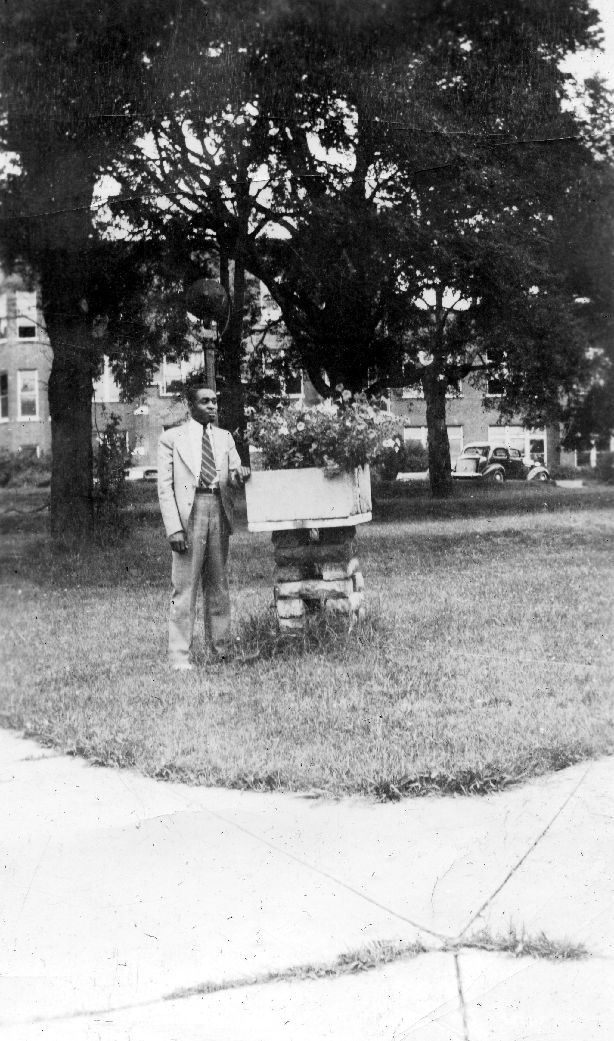 Man standing near flowers at Tuskegee University in Tuskegee, Alabama