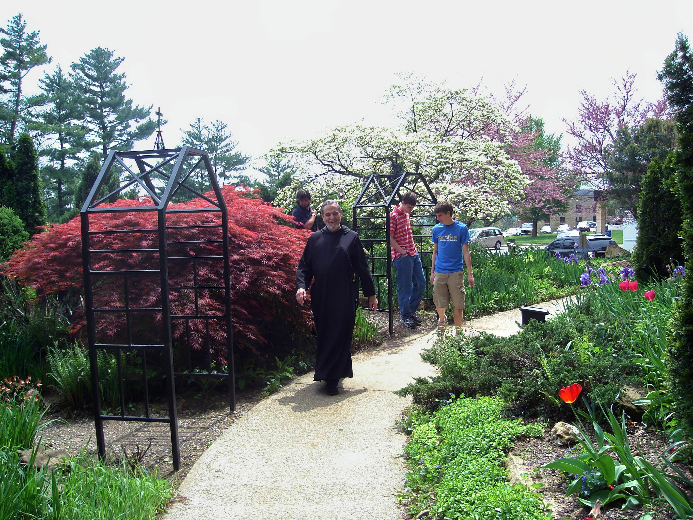 Brother Maurice and Hanover College students touring Meditation garden