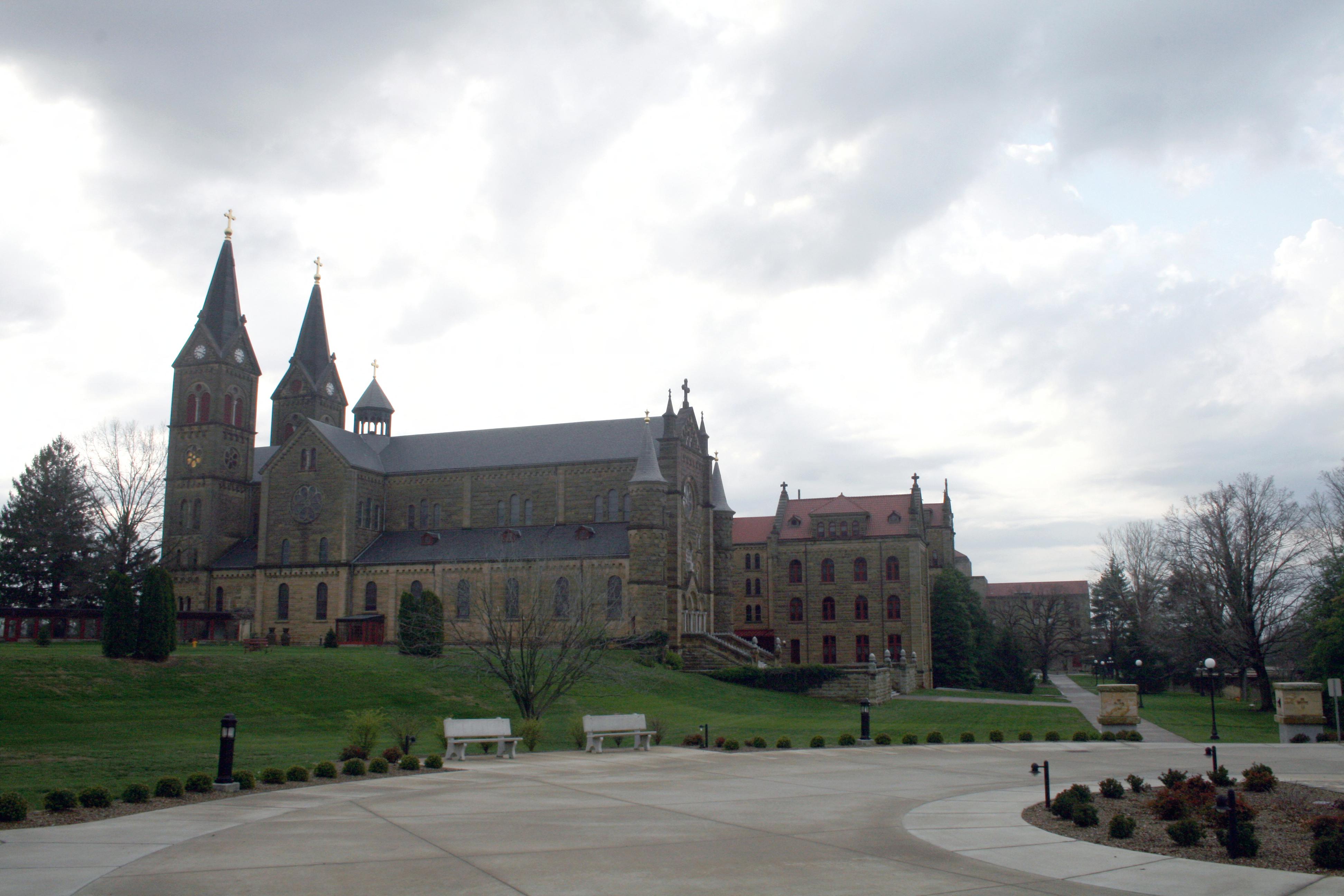 Looking south at the Archabbey church, and seminary with the St. Meinrad Court circle to the right