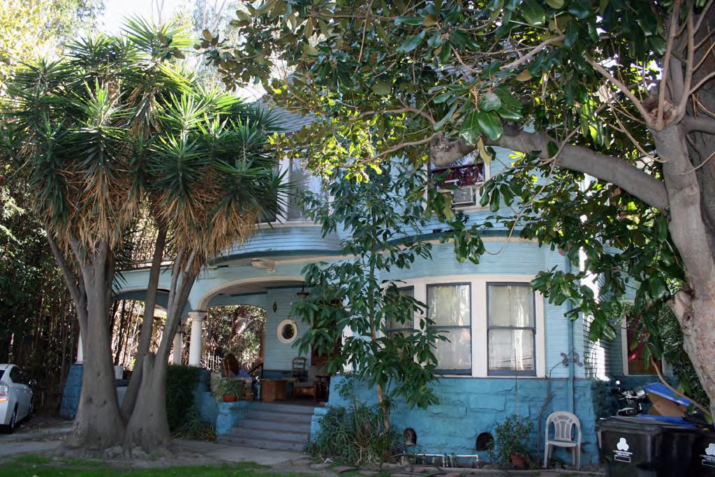 Blue building with cars in front