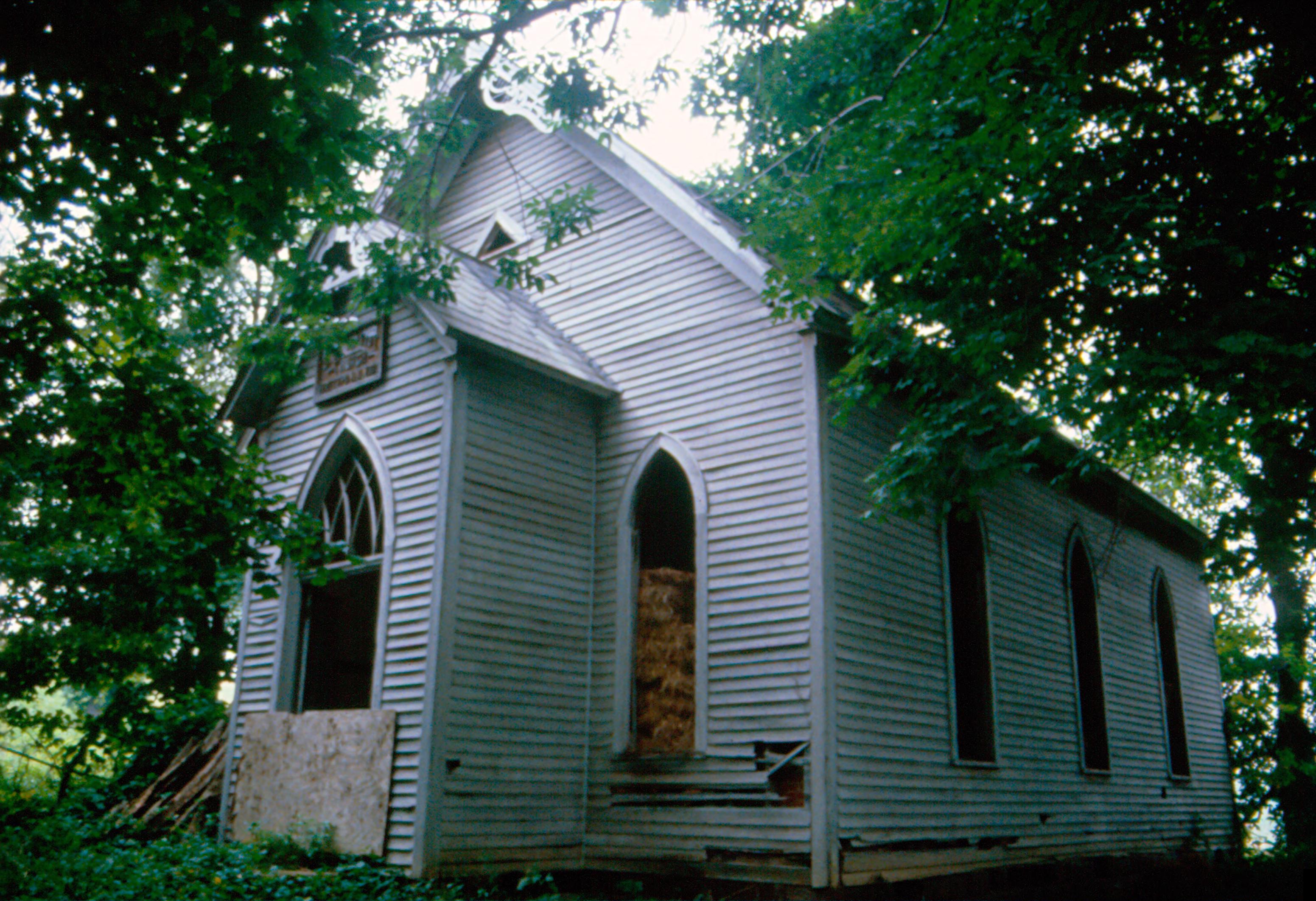 Abandoned Baptist church near possible former Columbian Phalanx cemetery
