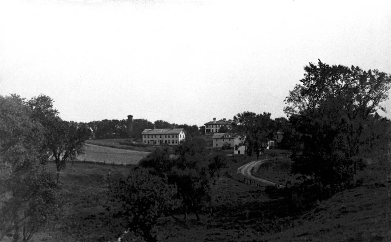 West Group for male Colonists. In foreground old Shaker buildings, some used for Colonists. In background, Iroquois, one of the group of fireproof buildings for male Colonists.