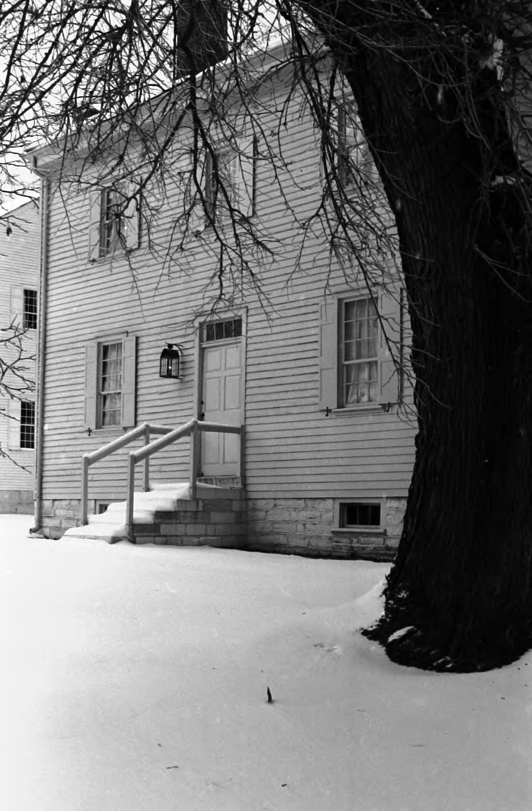View northwest at the rear of the Ministry's Work Shop with the Meeting House