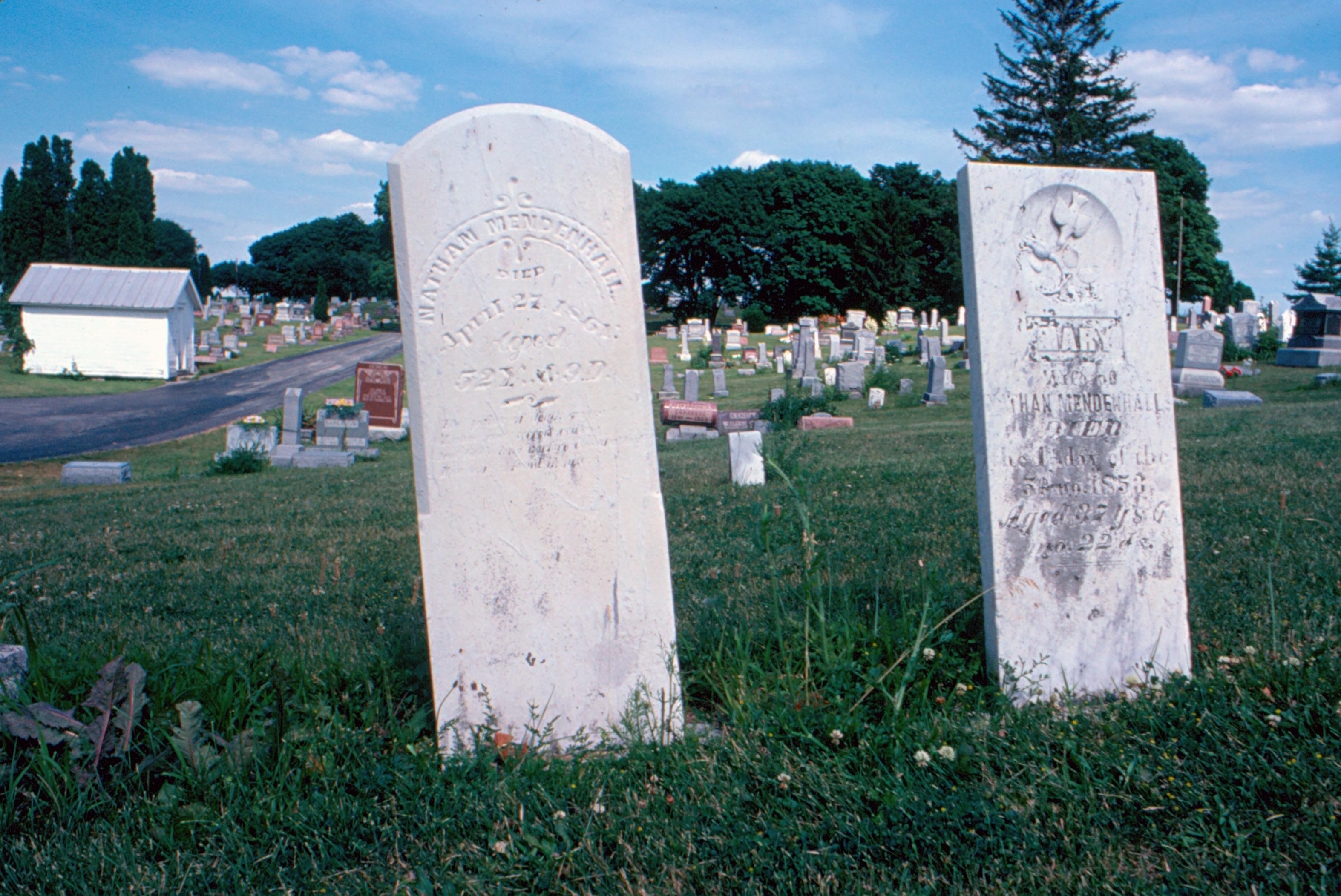 Gravestone (left) of Nathan Mendenhall, brother of founder