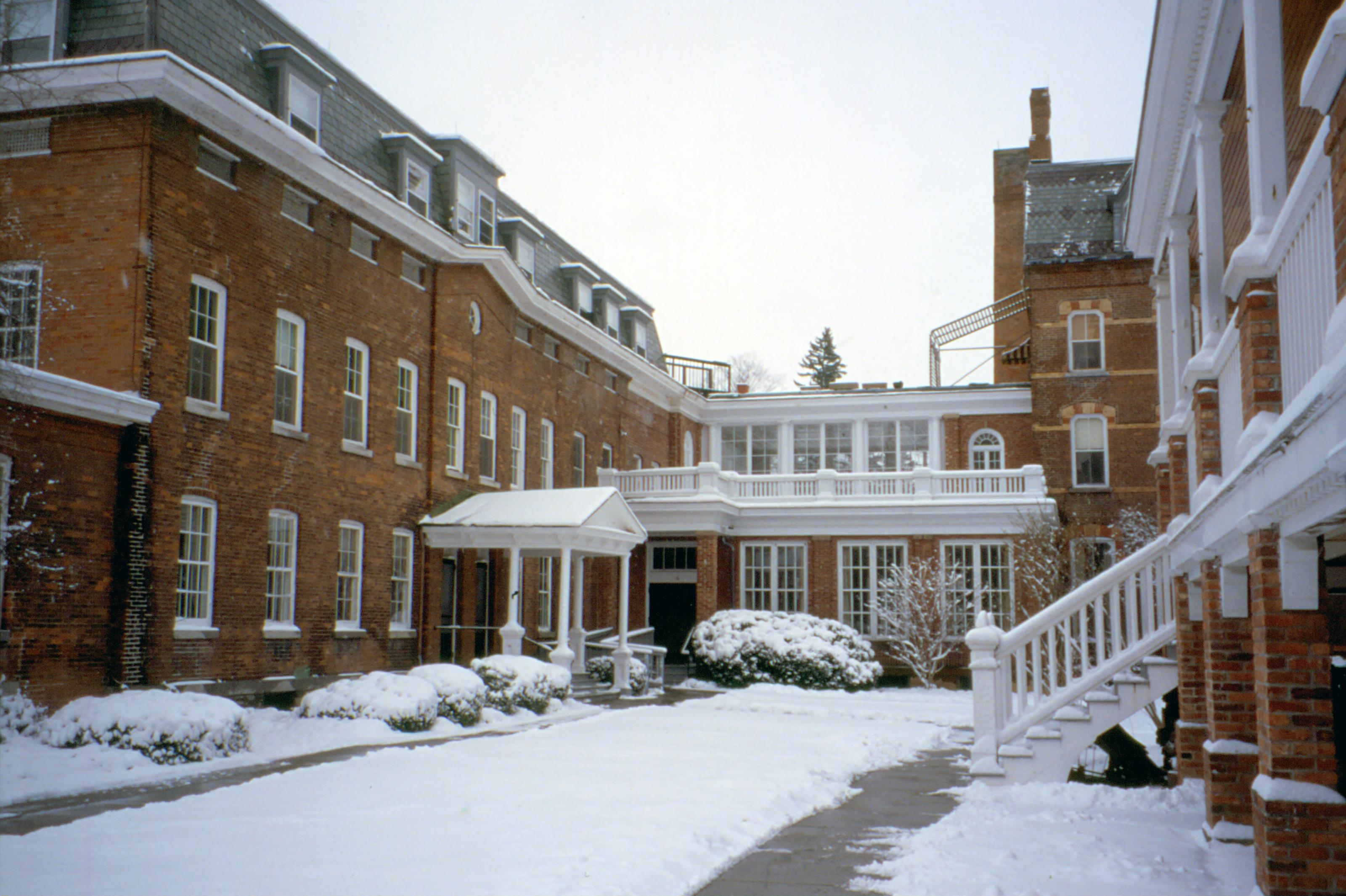 The interior courtyard of the mansion house looking at the longue (center) and the north wing (right), snow scene