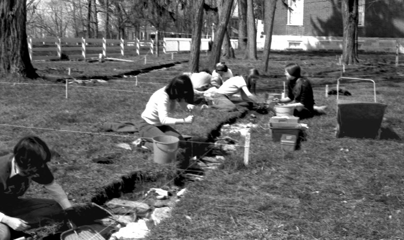 Centre College students excavating foundation of East 1809 log building in Pleasant Hill
