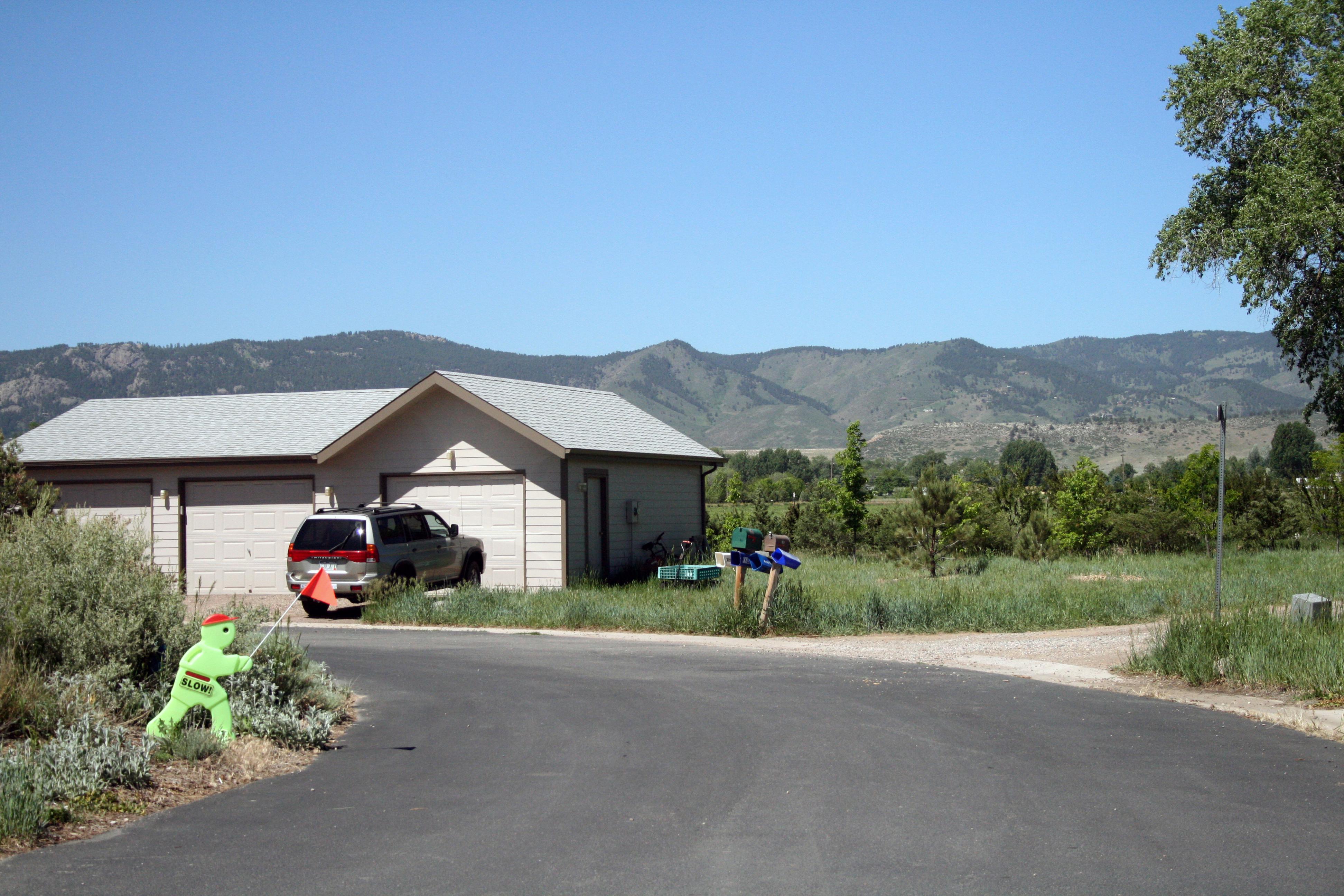 Rear of community houses with foothills of Rocky Mountains in background