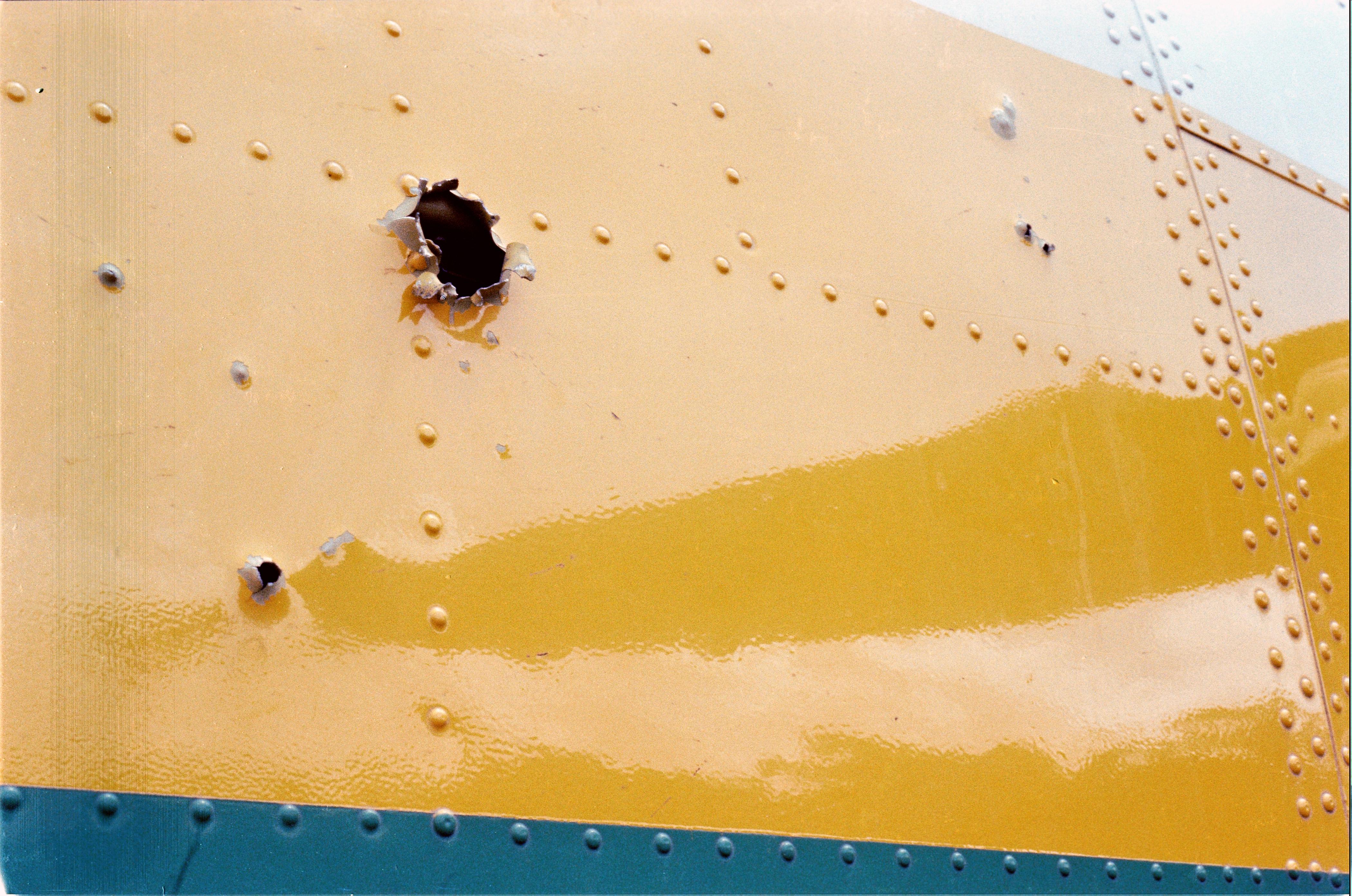 A bullet hole shot clean through the hull of a Guyana Airways passenger plane.