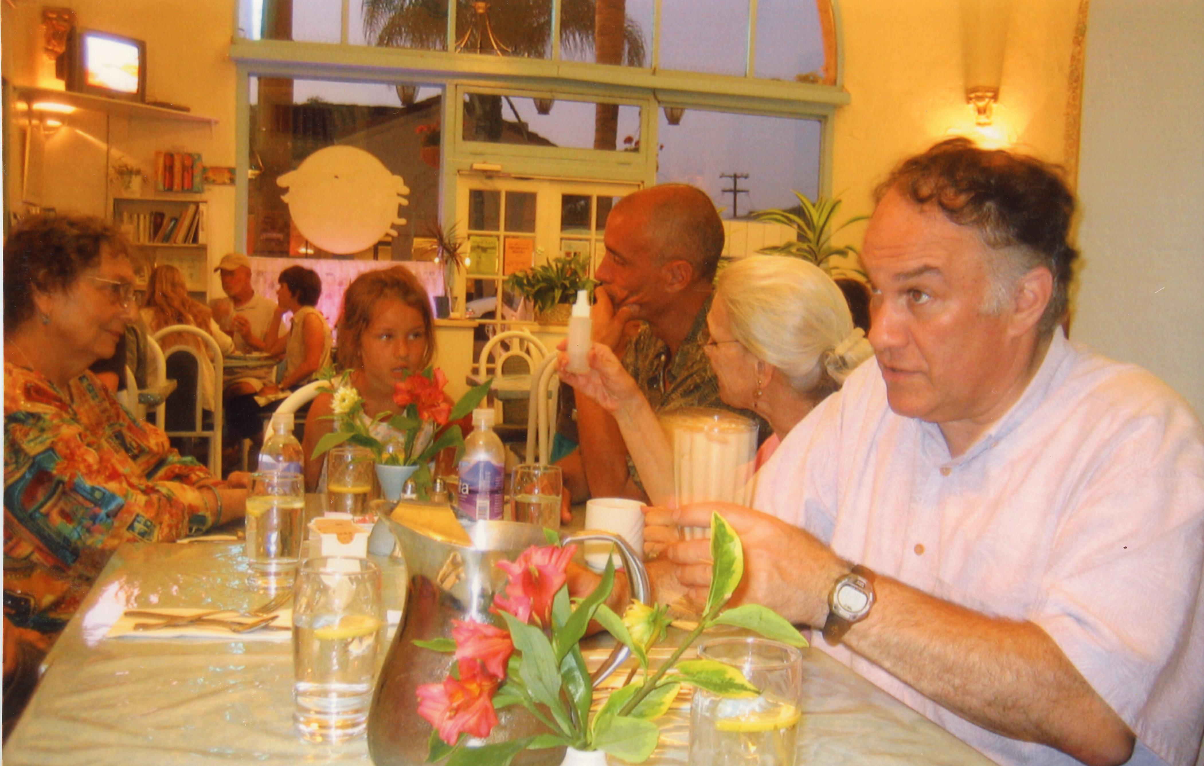 Stephan Jones sits across Claire Janaro with a group of unknown people at restaurant.
