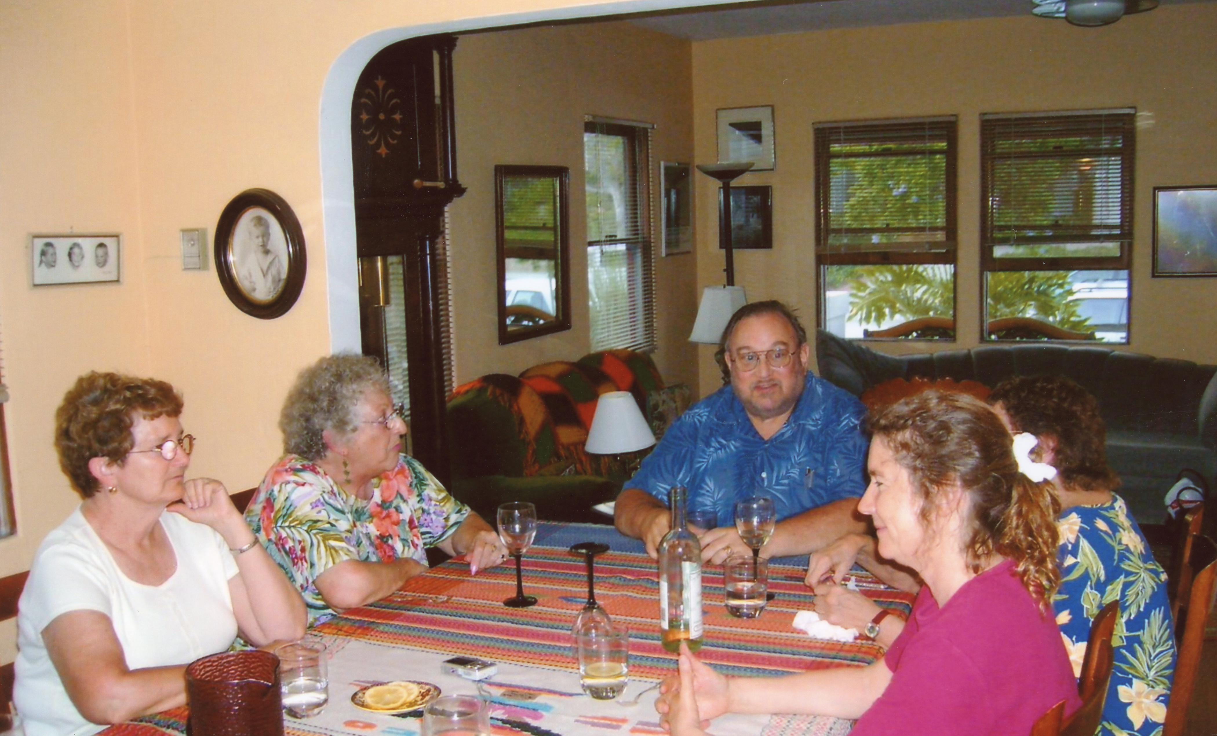 A group with Laura Johnston Kohl, an unknown woman, Don Beck, Claire Janaro, and Rebecca Moore sits inside together. (L to R)