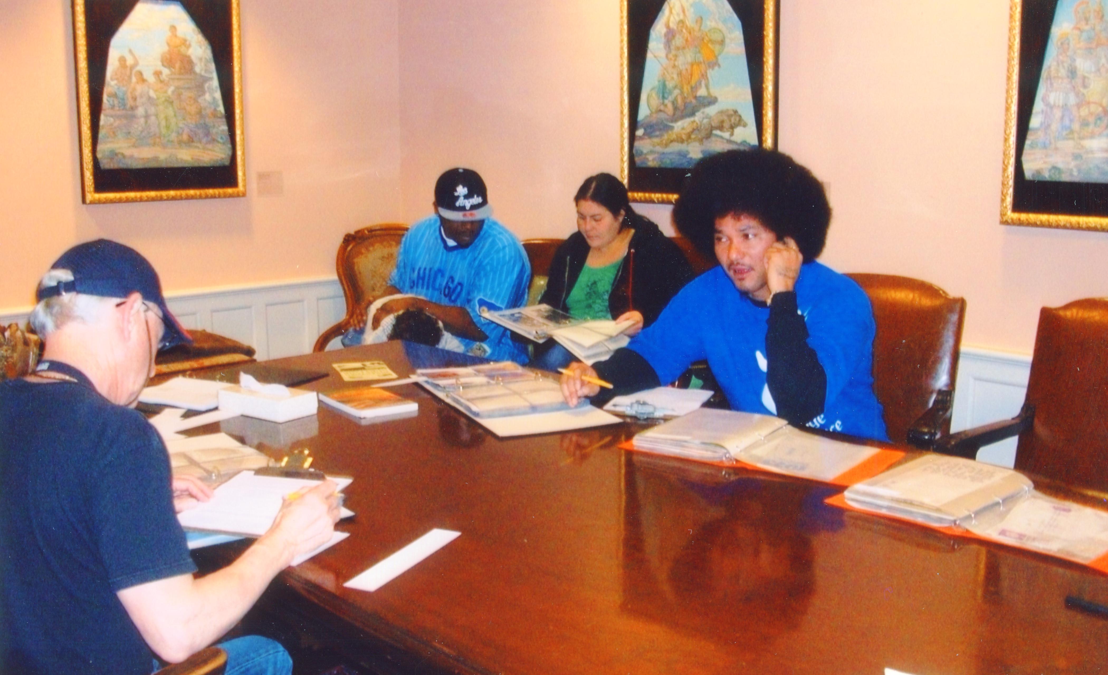Jordan , Kathy, Chris, and Jim Randolph look at old photos at the California Historical Society