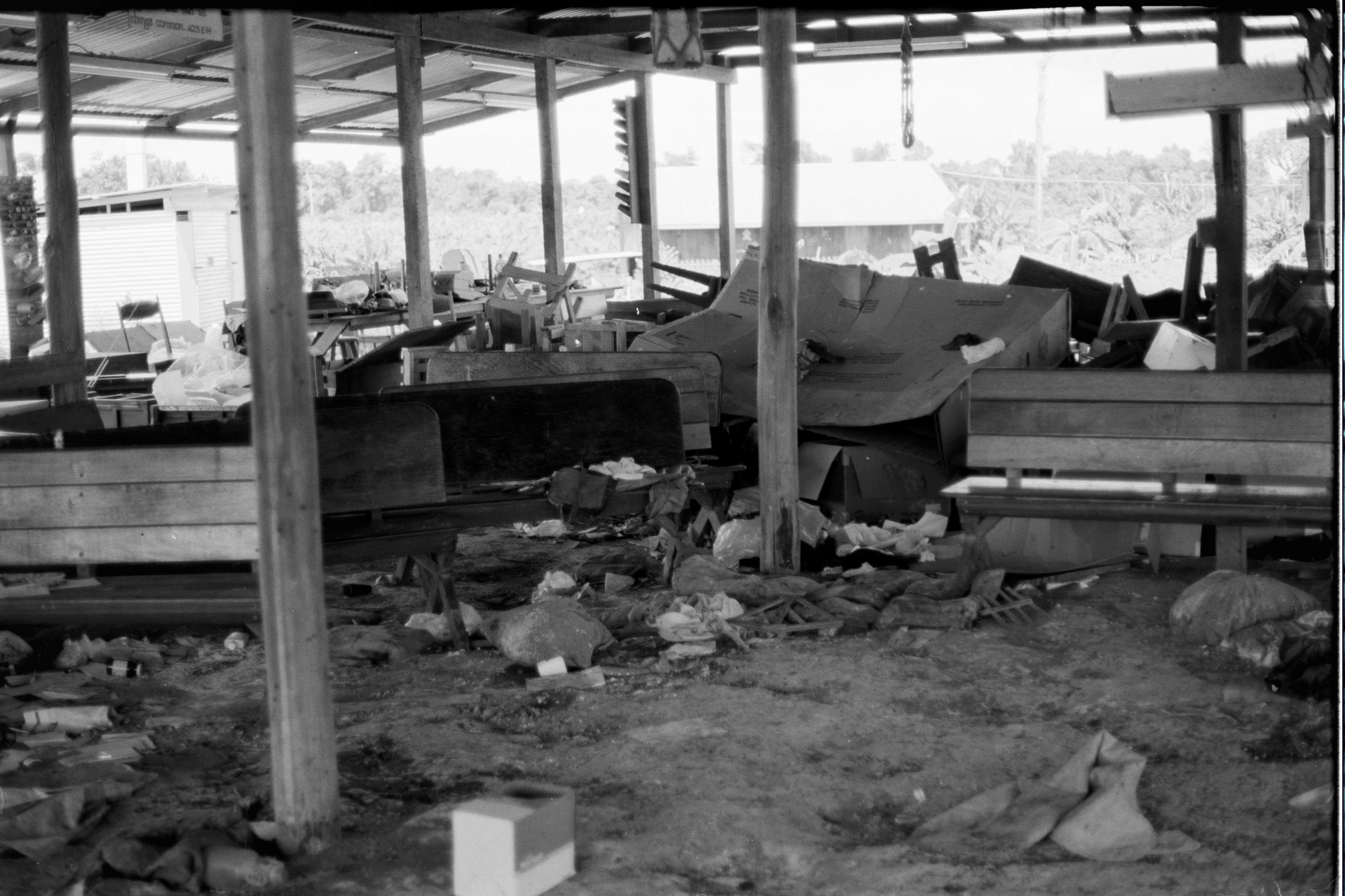 Pavilion building with debris and picnicn tables overturend after during the cleanup in Jonestown.