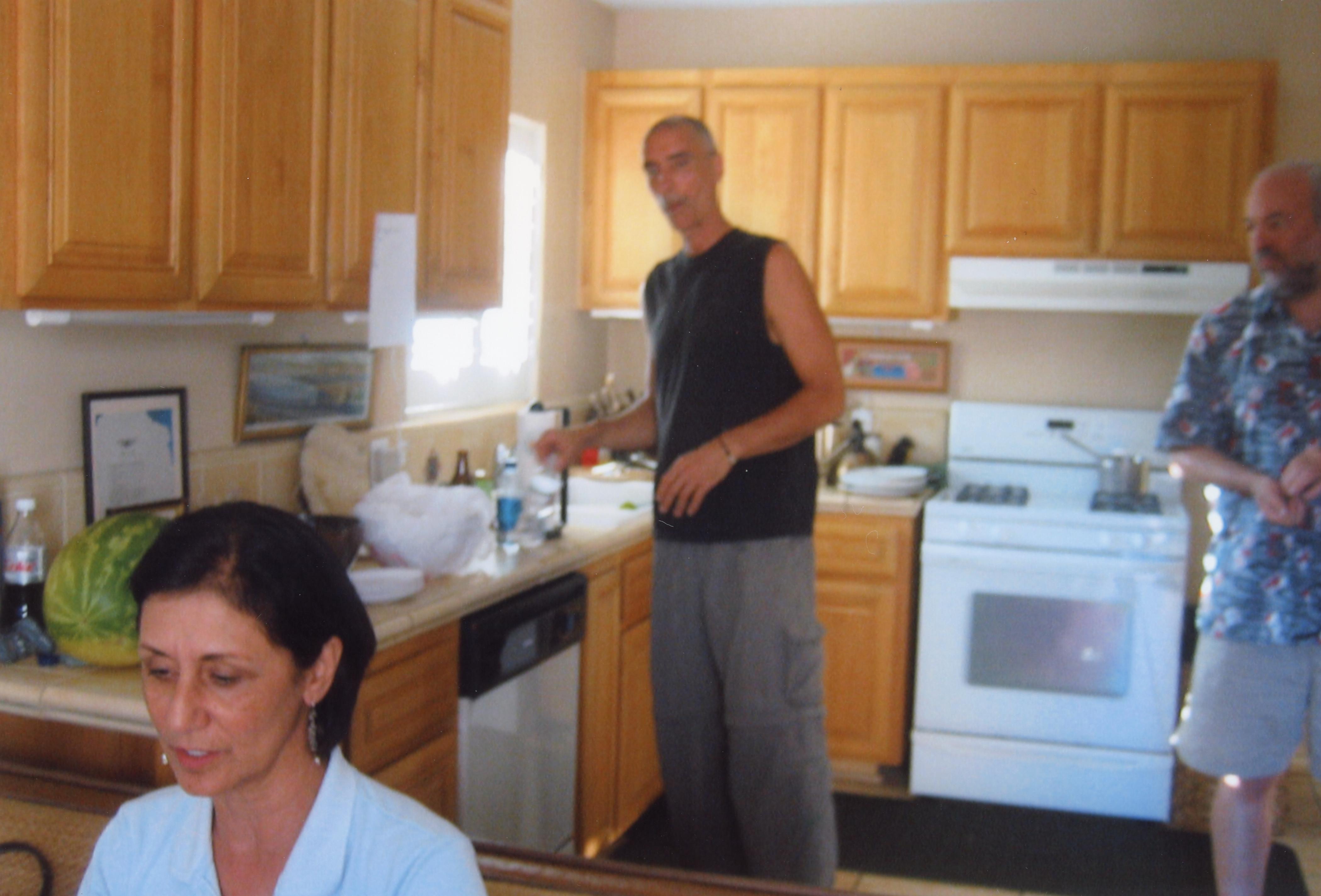 Stephan Jones sets down a water bottle in the kitchen inside during a reunion event. (Grace Stoen and Fielding M. McGehee (Mac) are also pictured).