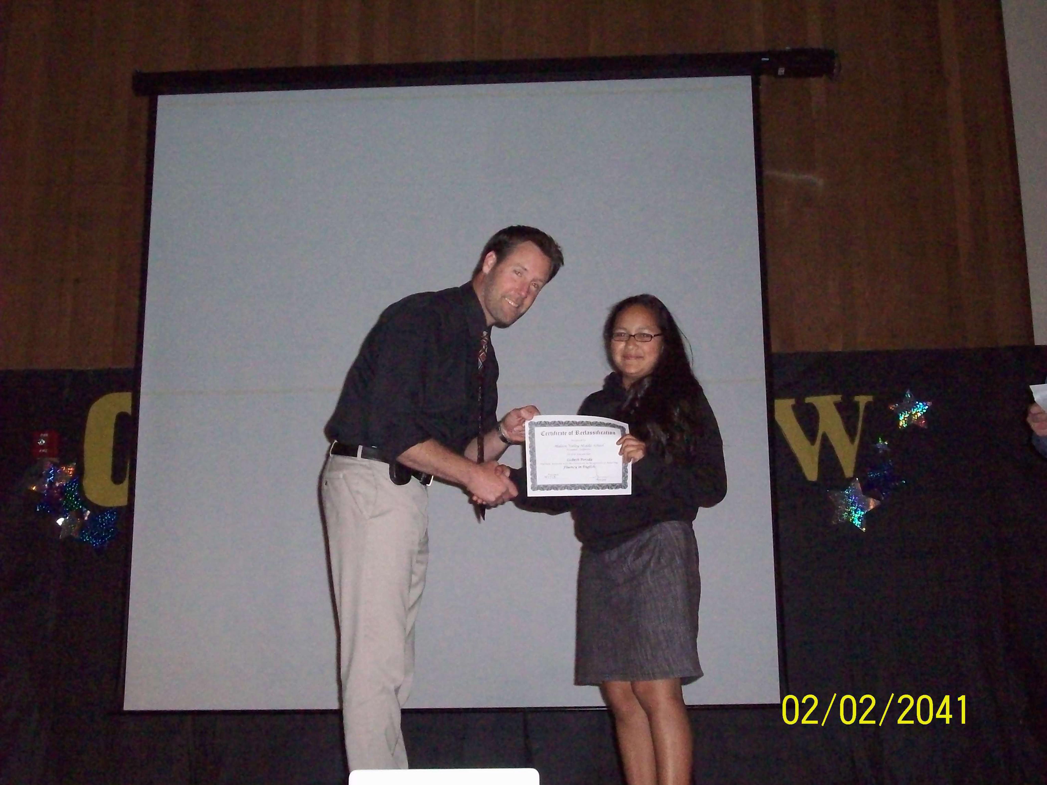 A young girl receives a Certificate of Reclassification for her Fluency in English from Hidden Valley Middle School.