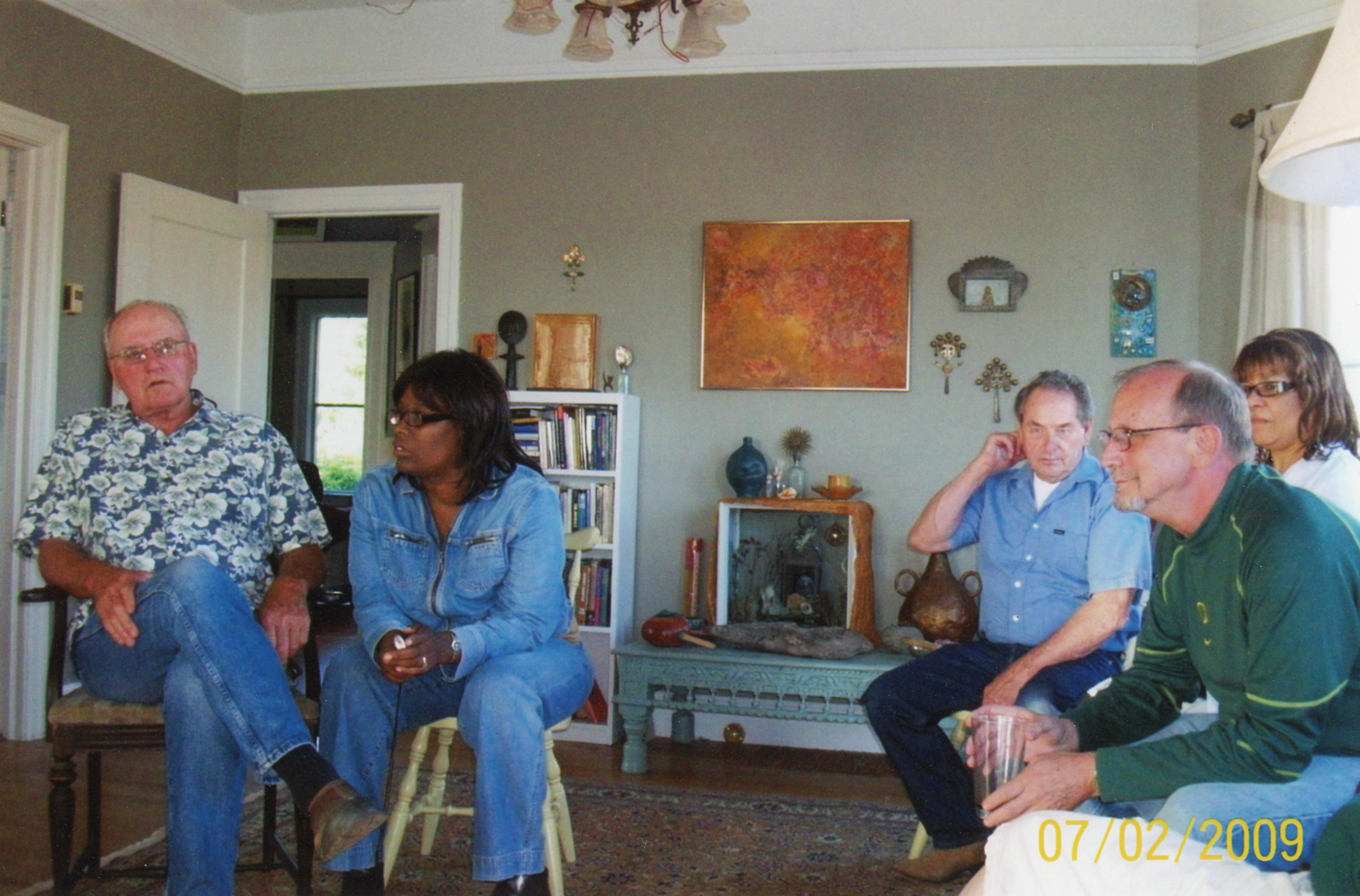 Guy, Bunny Jackson, Walter, Leslie Wagner-Wilson, and Tim Carter sit around and talk in the living room