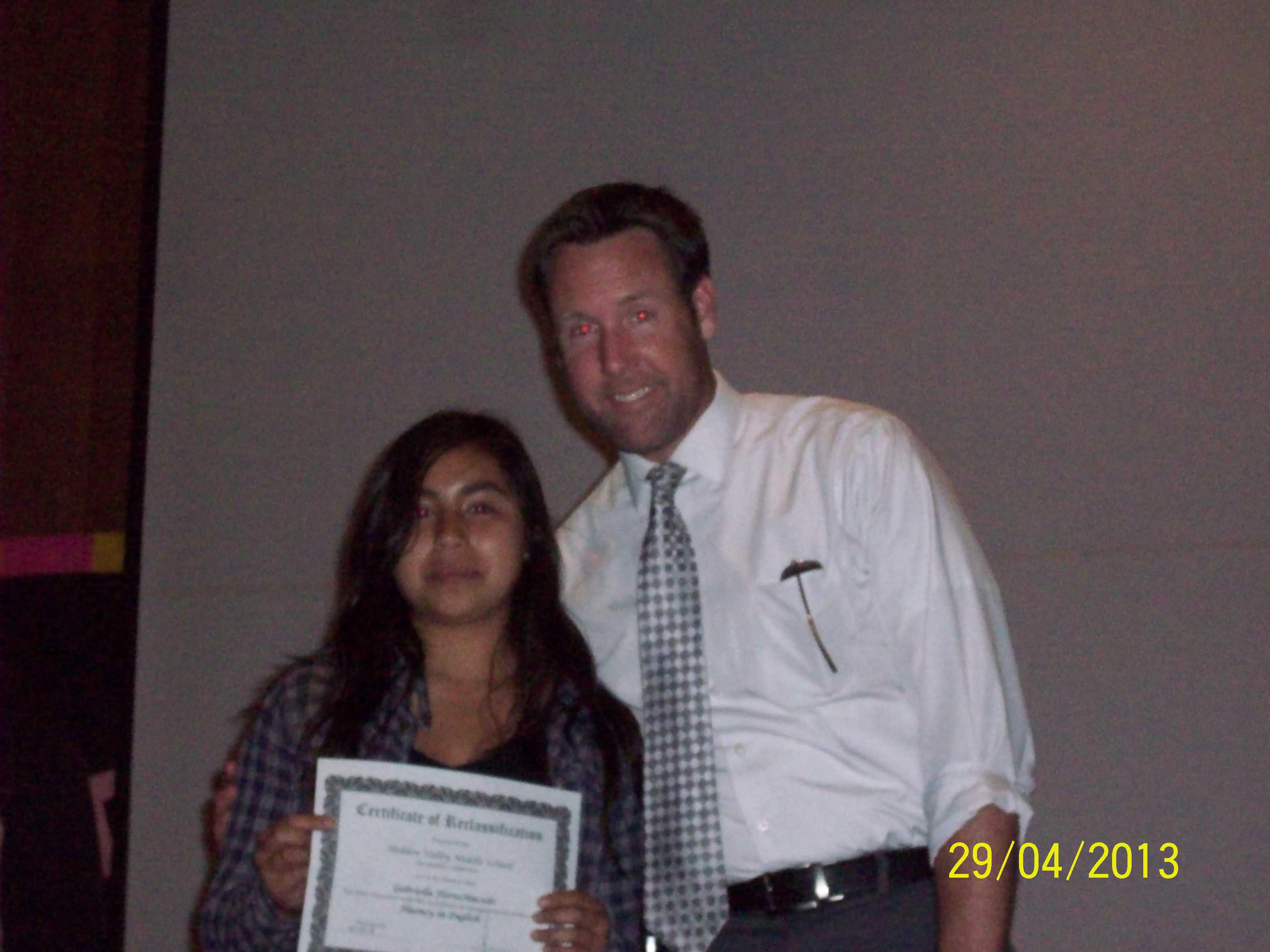 A girl poses with her award for her fluency in English from Hidden Valley Middle School.