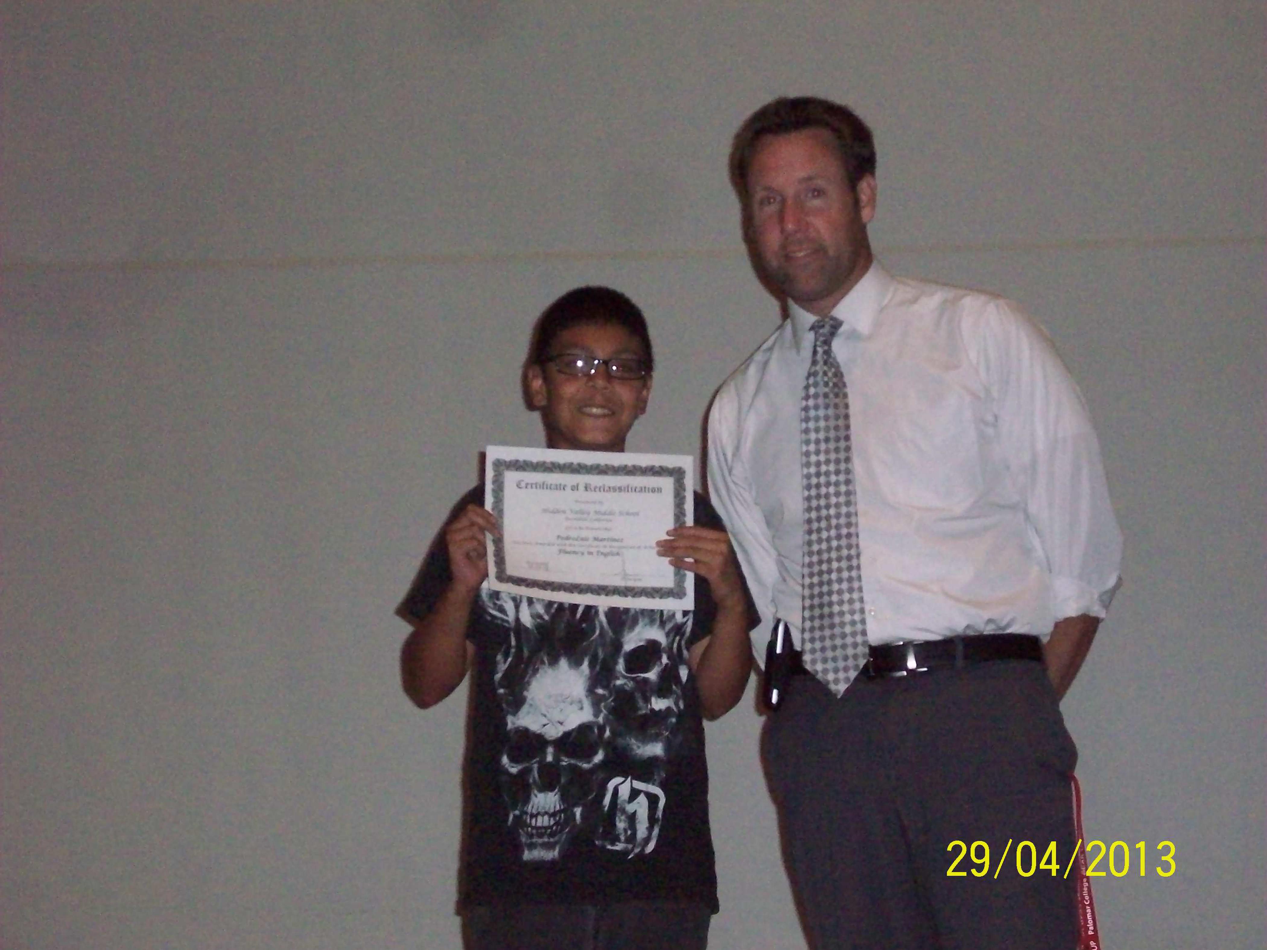 A boy poses with his award for his fluency in English from Hidden Valley Middle School.