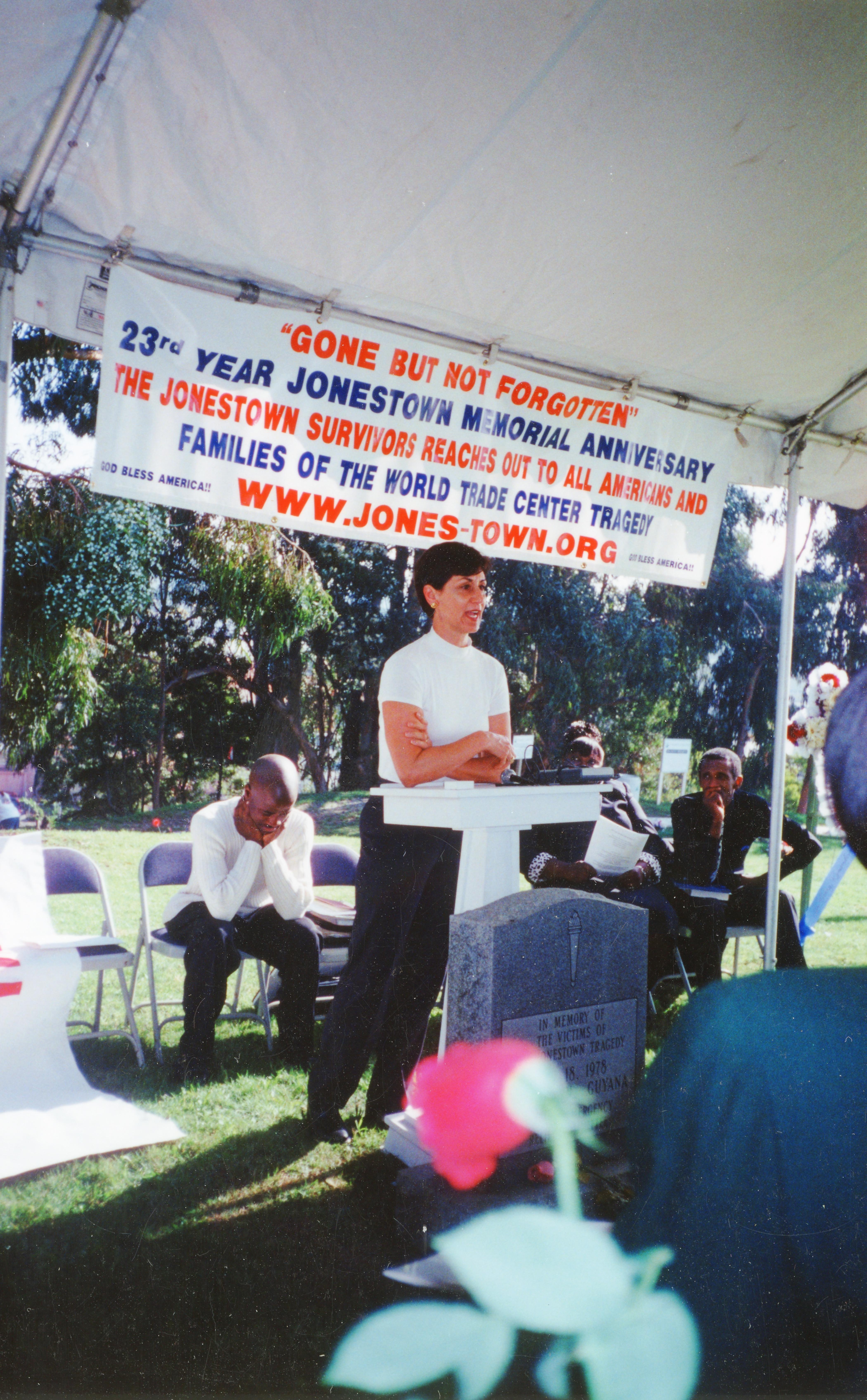 A woman (Grace) gives a moving presentation at the Jonestown Memorial Ceremony.