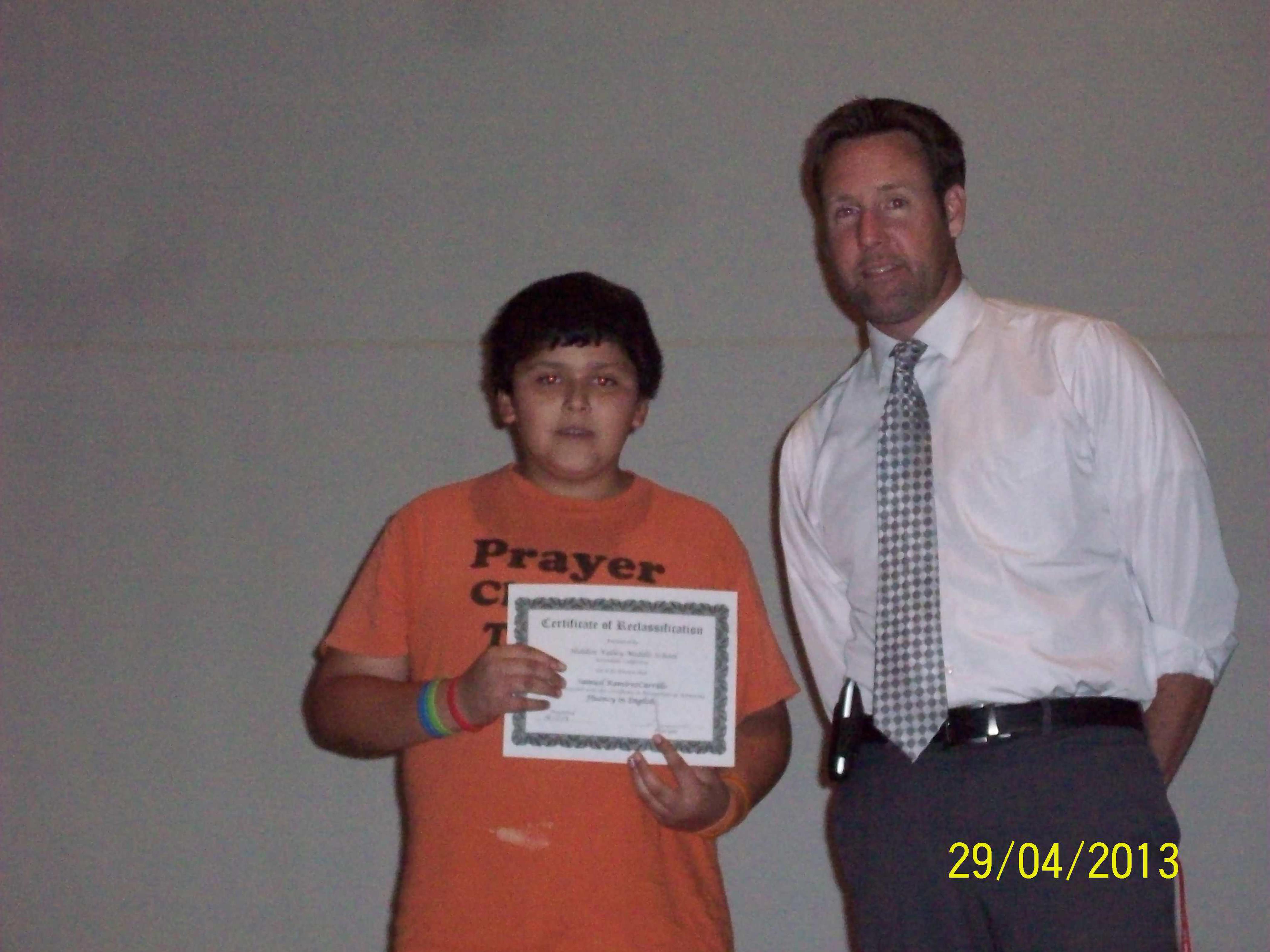 A boy poses with his award for his fluency in English from Hidden Valley Middle School.