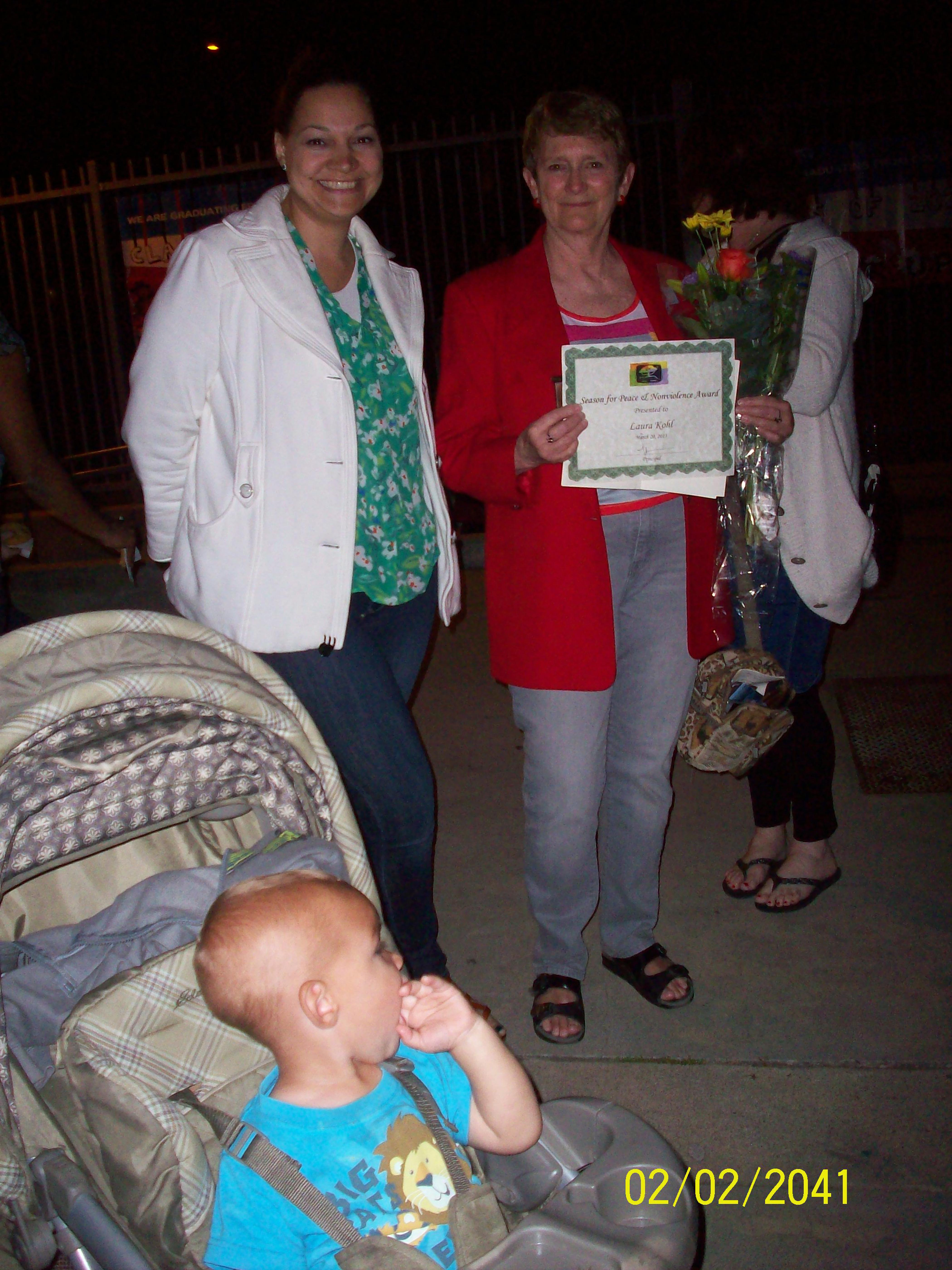 Laura posing with an award for ""Season for Peace & Non-Violence"" presented to her on March 20, 2013.