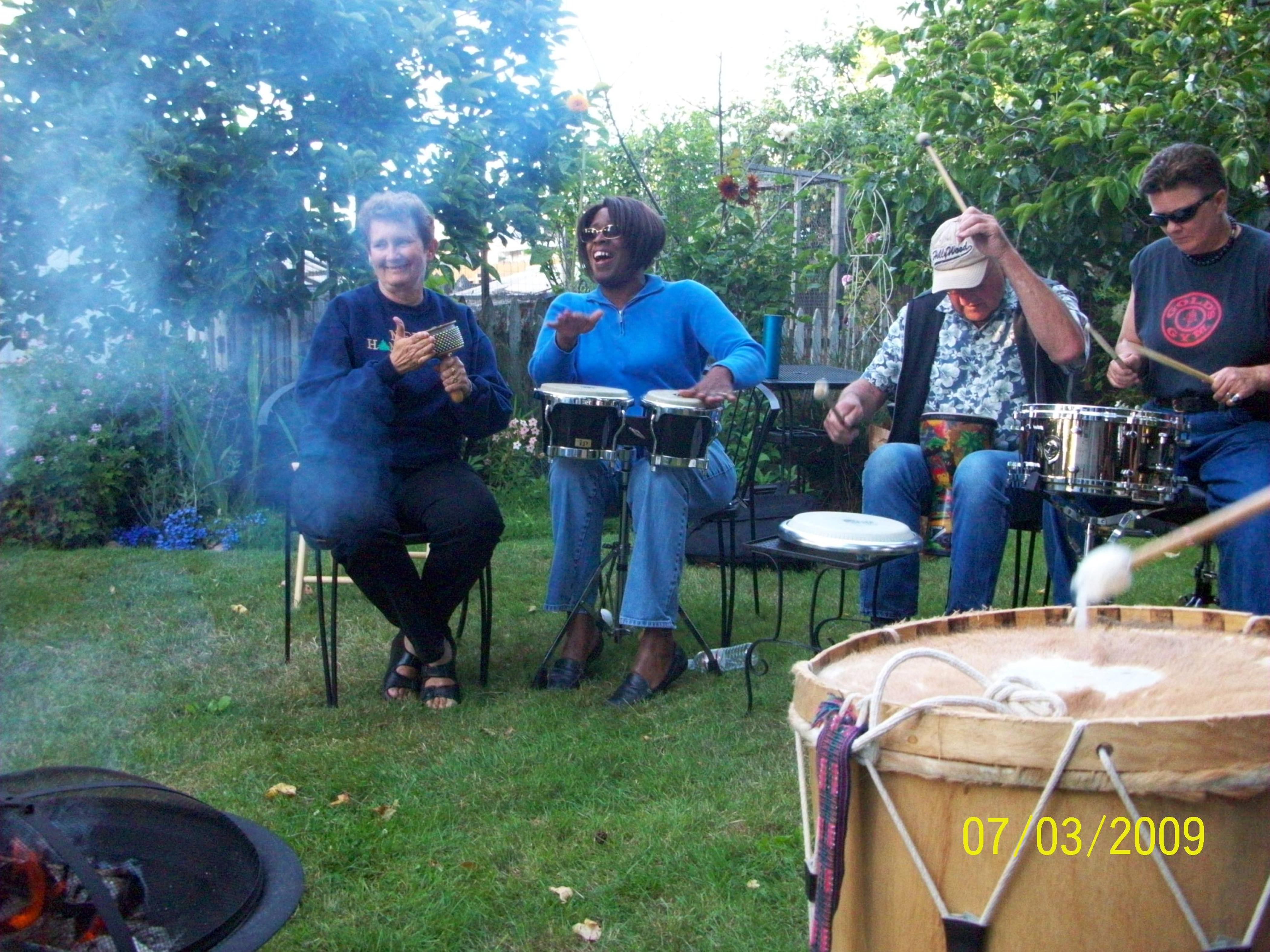 Laura Johnston Kohl, Bunny Fackson, and two others play instruments outside around a fire.