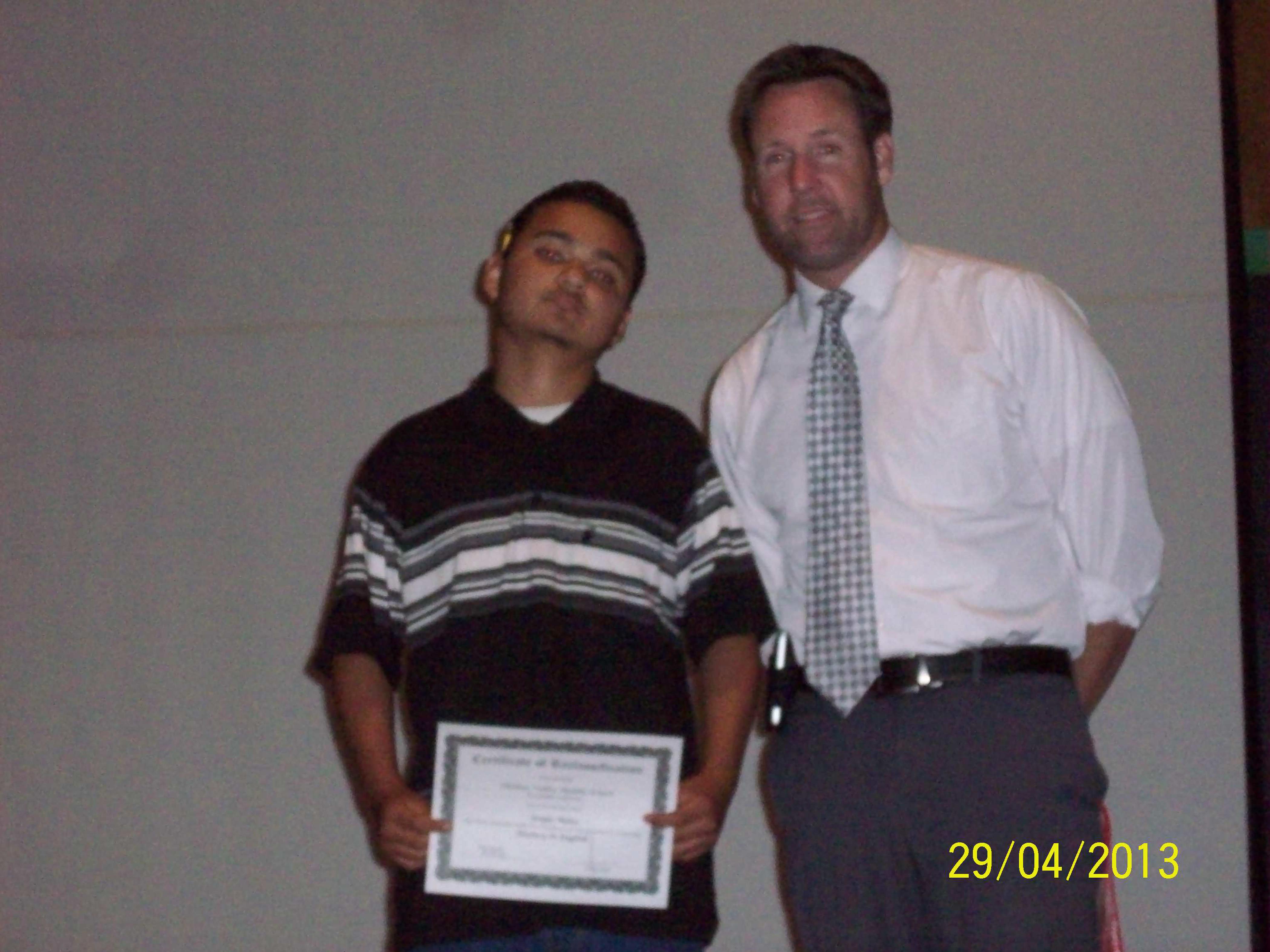 A boy poses with his award for his fluency in English from Hidden Valley Middle School.