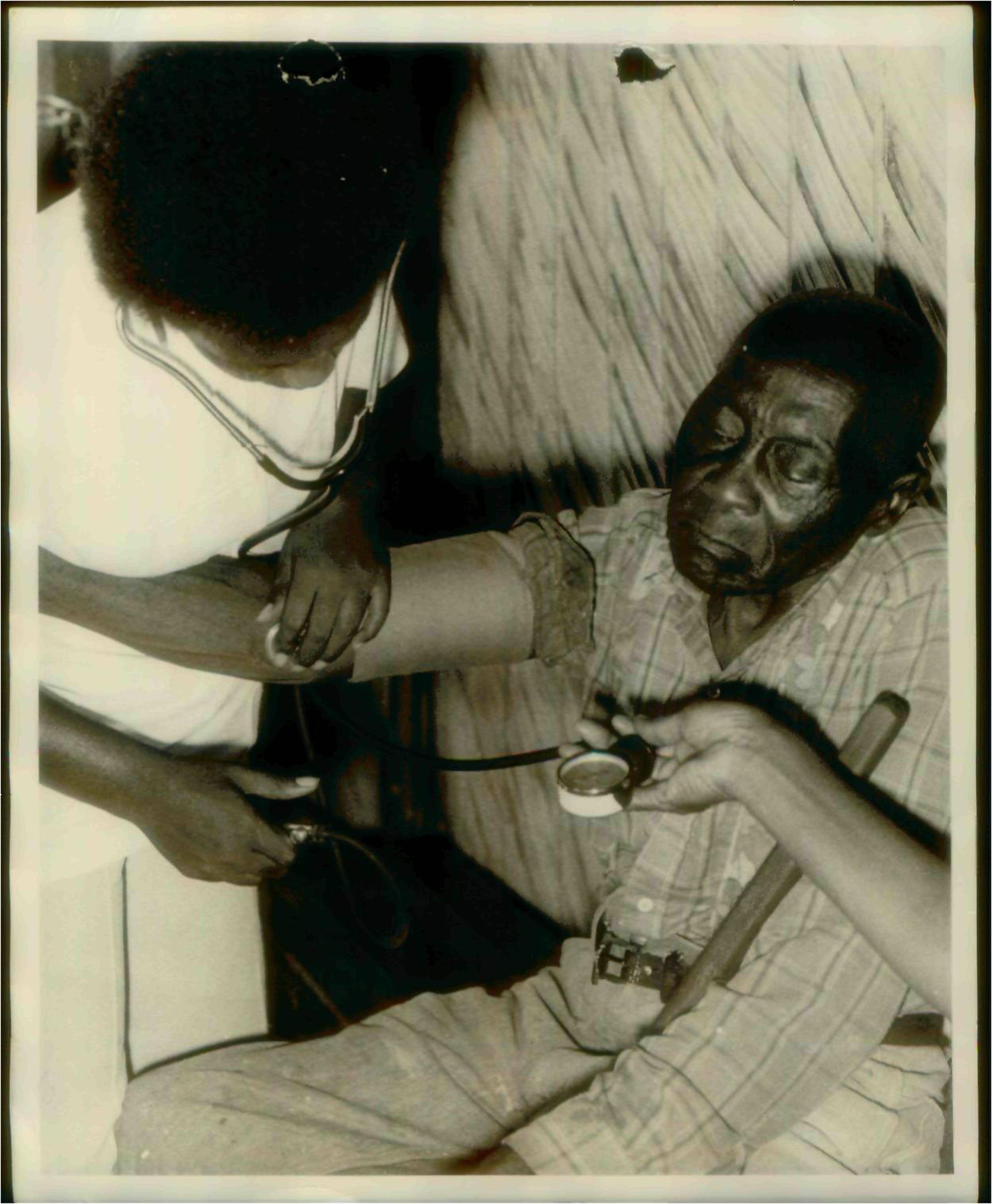 A man gets his blood pressure checked by a nurse and her assistant off camera in the infirmary in Jonestown.