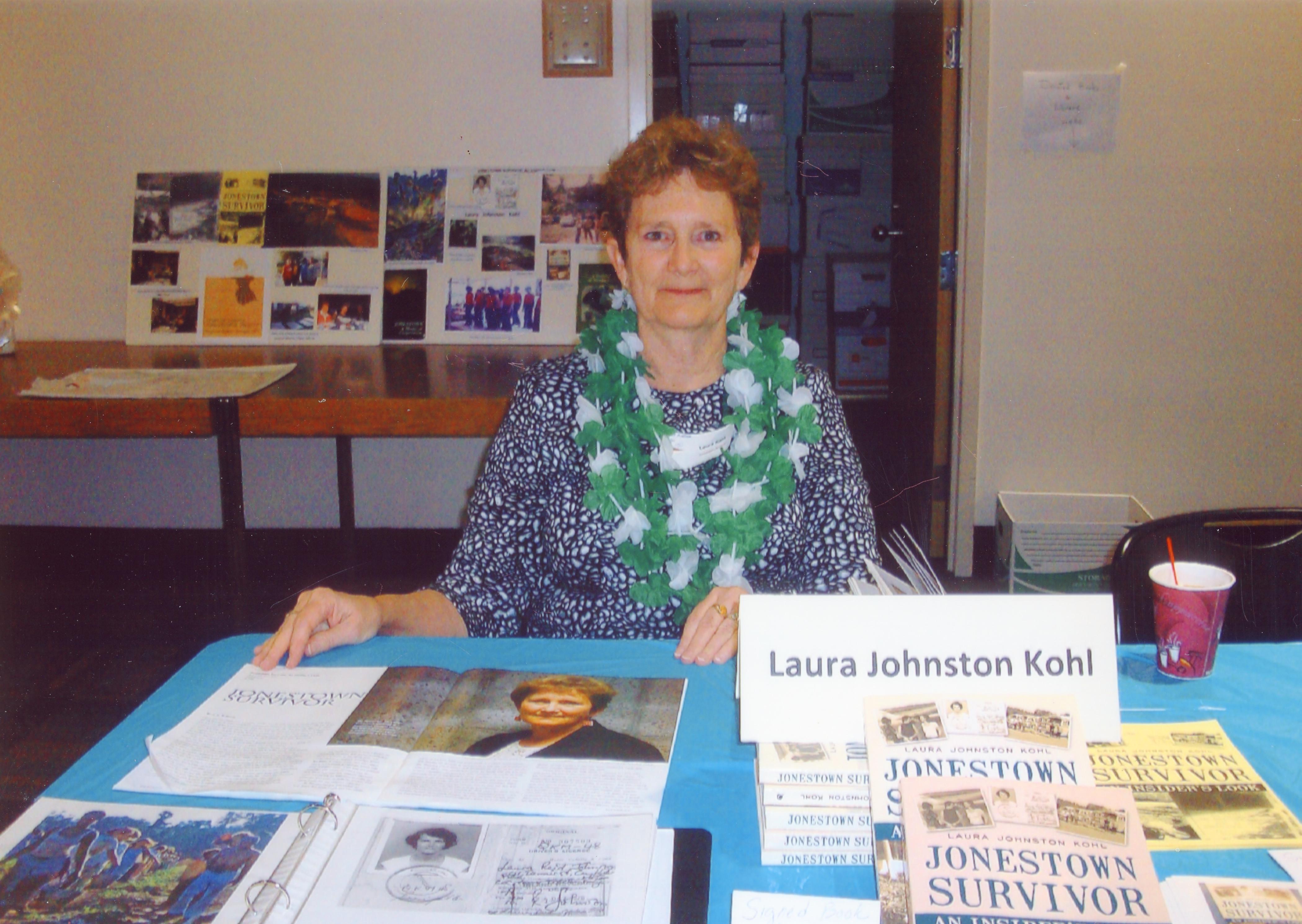 Laura Johnston Kohl poses with her book ""Jonestown Survivor"" at a book tour booth