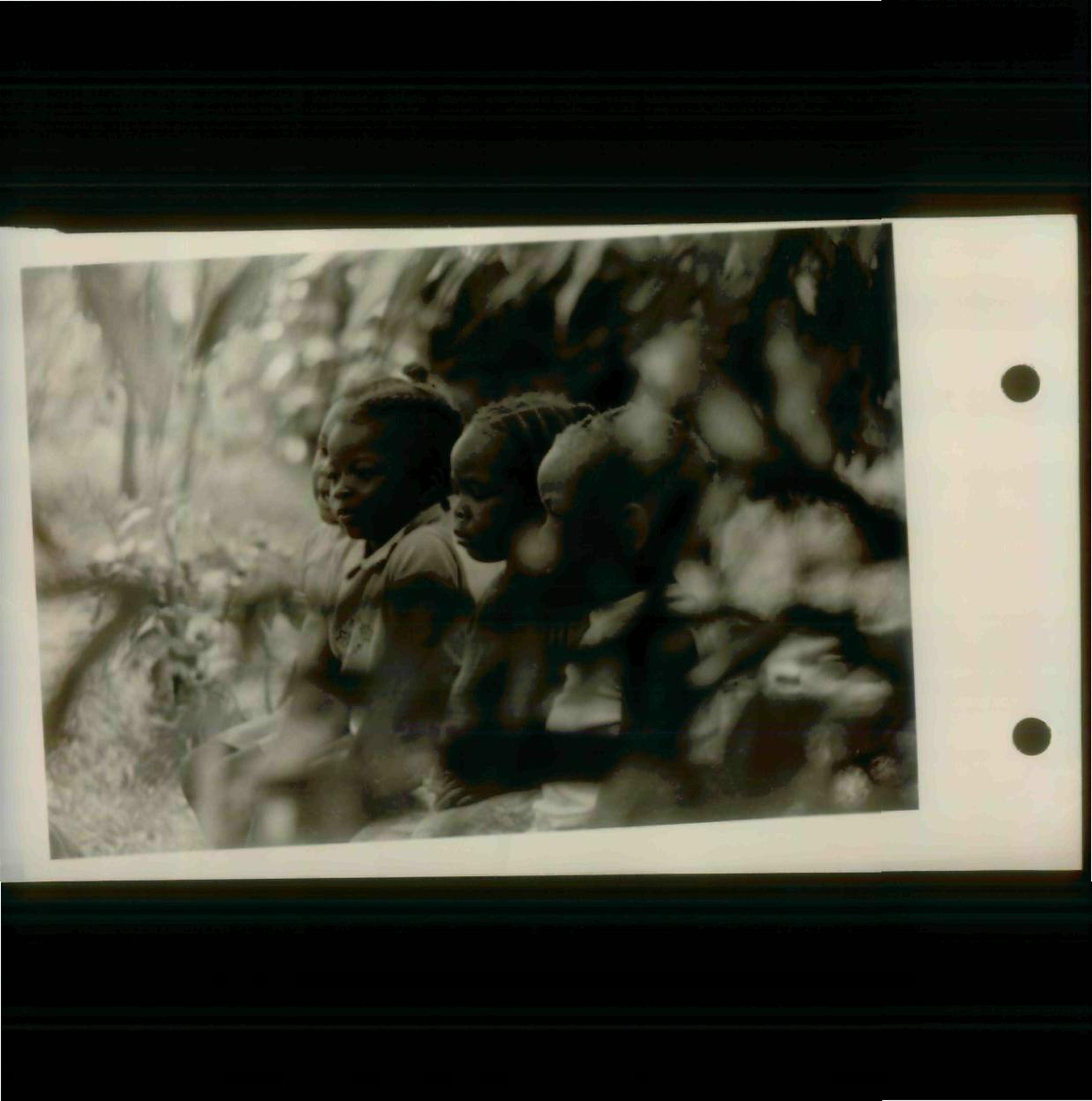 Four children sit on a bench in front of a line of trees in Jonestown.