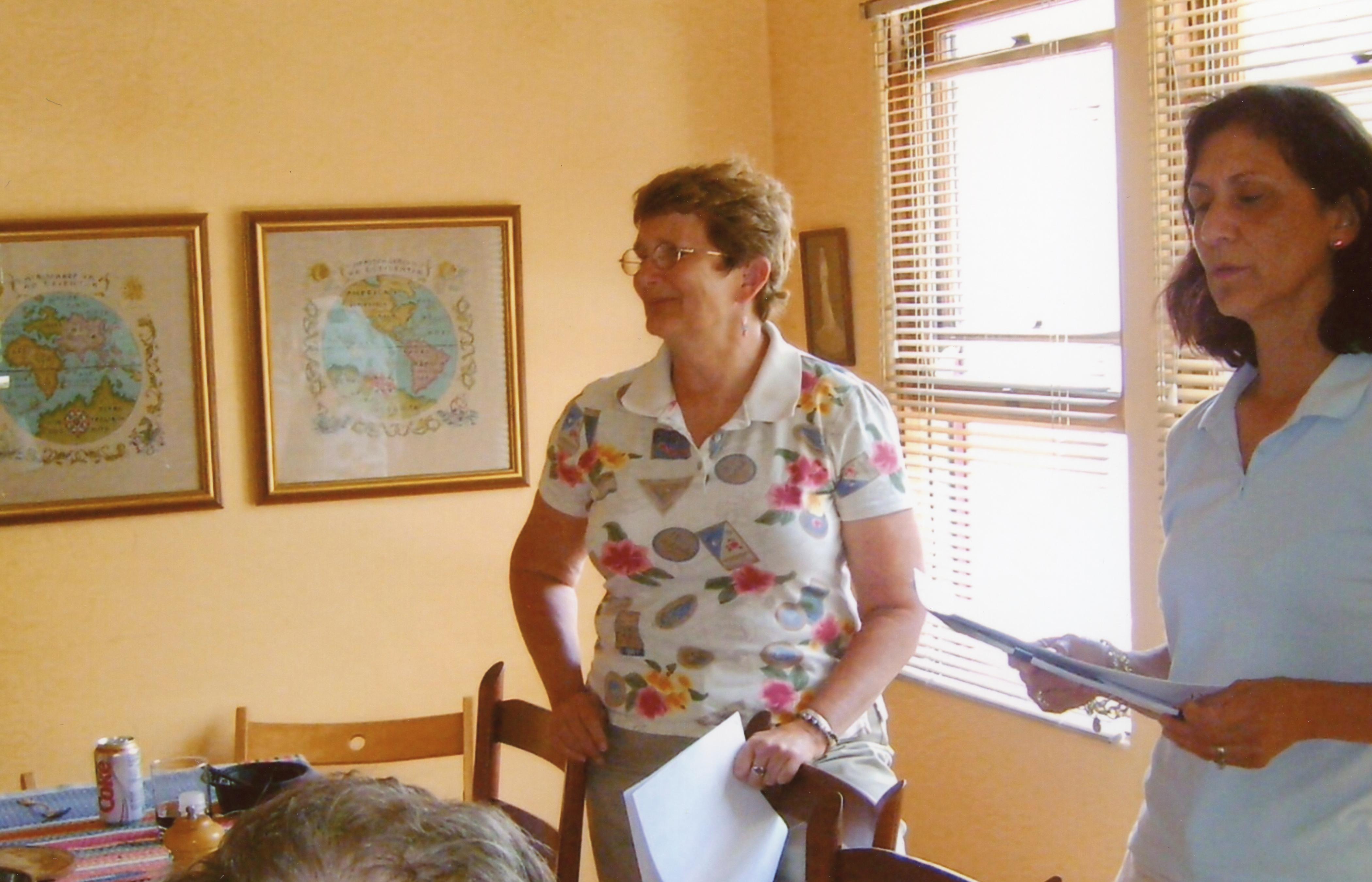 Laura Johnston Kohl and Grace Stoen talk to a group of friends.
