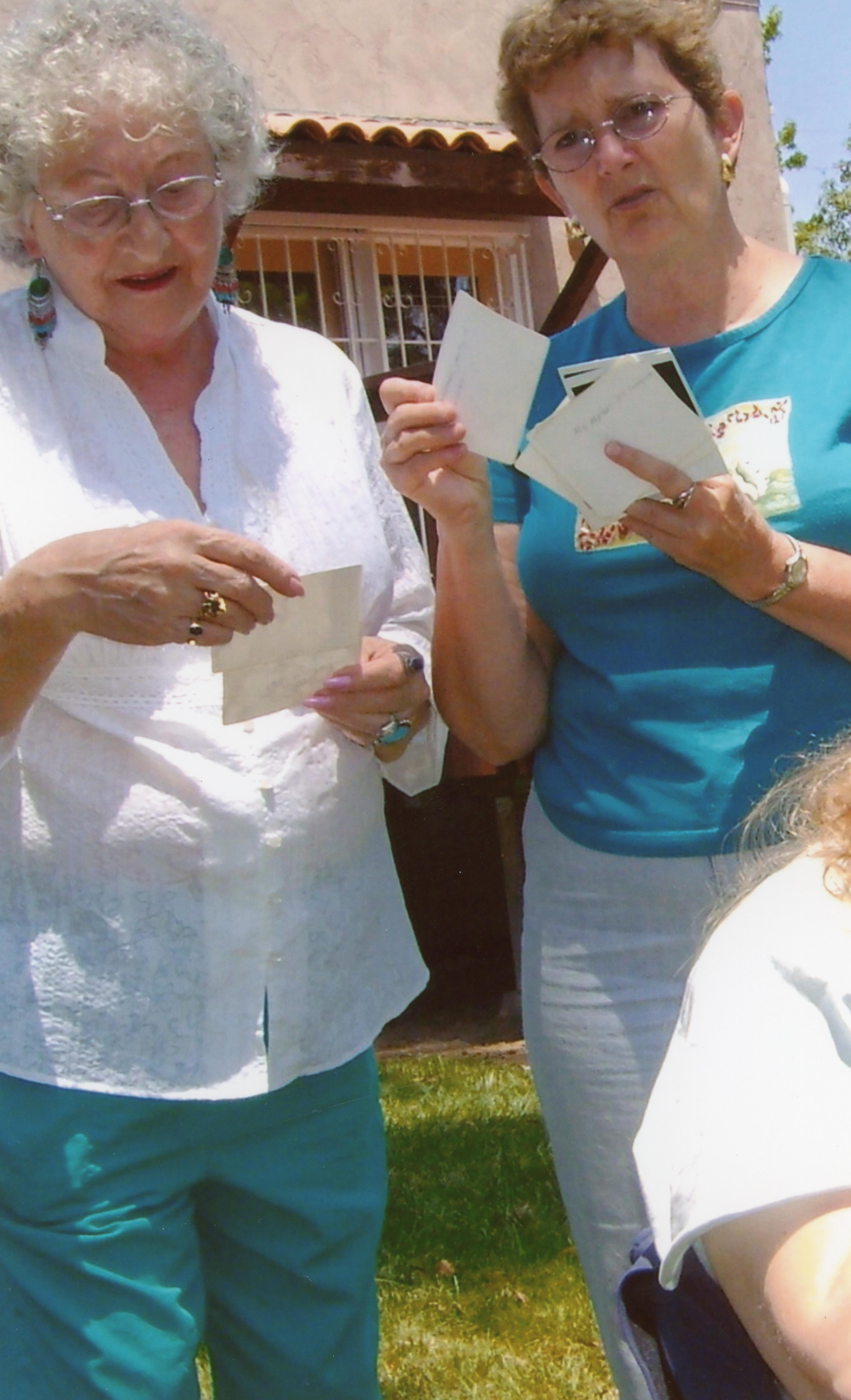 Laura Johnston Kohl shares photos with a friend during a reunion event.