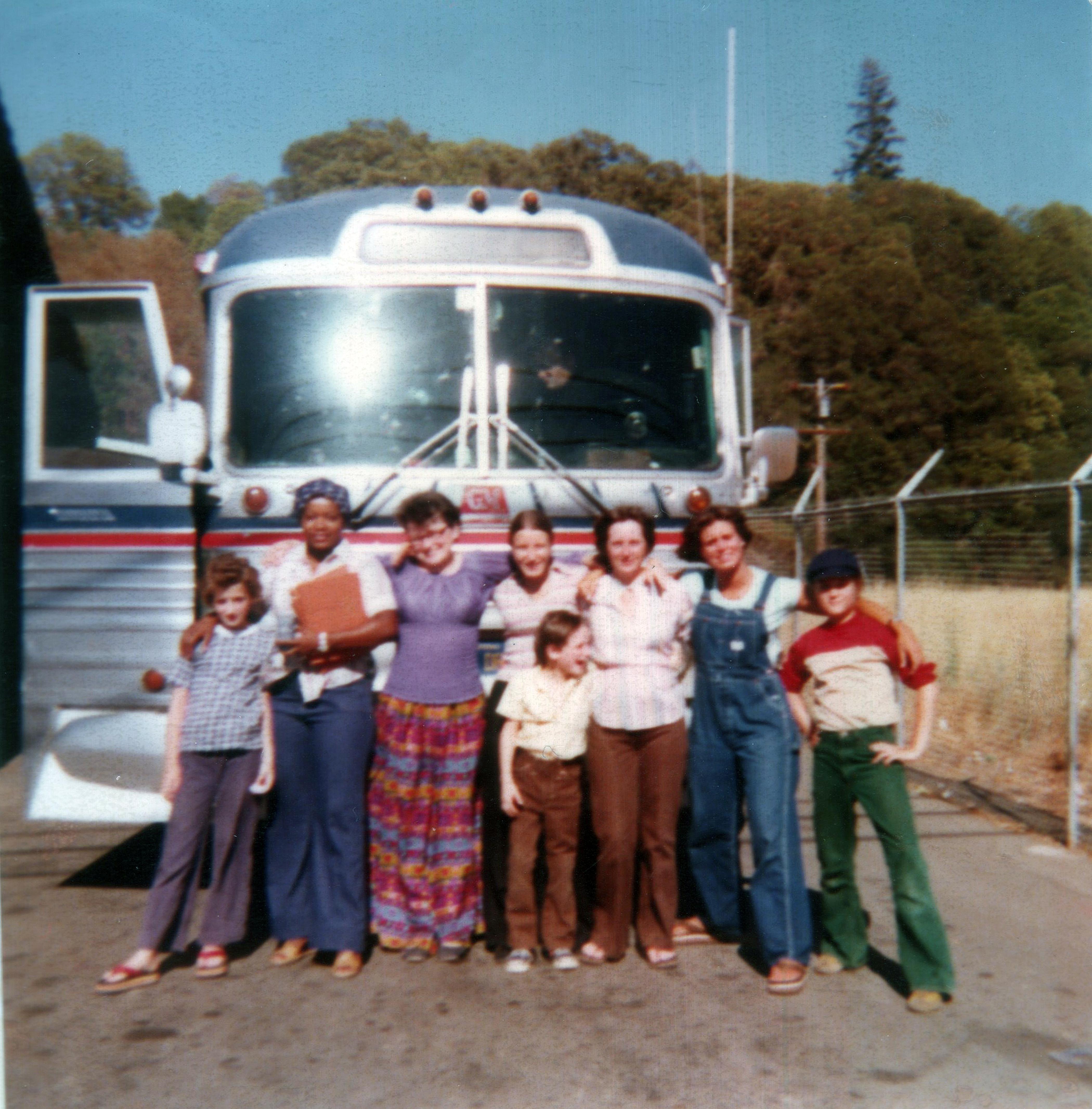 Stephanie Swaney, Renie Jackson, Suellen Williams, Christine Talley , Marlene Wheeler, (child Michalean Brady), Mary Lou Clancey, Jimmy Cordell stand in front of a bus on a trip with the Peoples Temple.