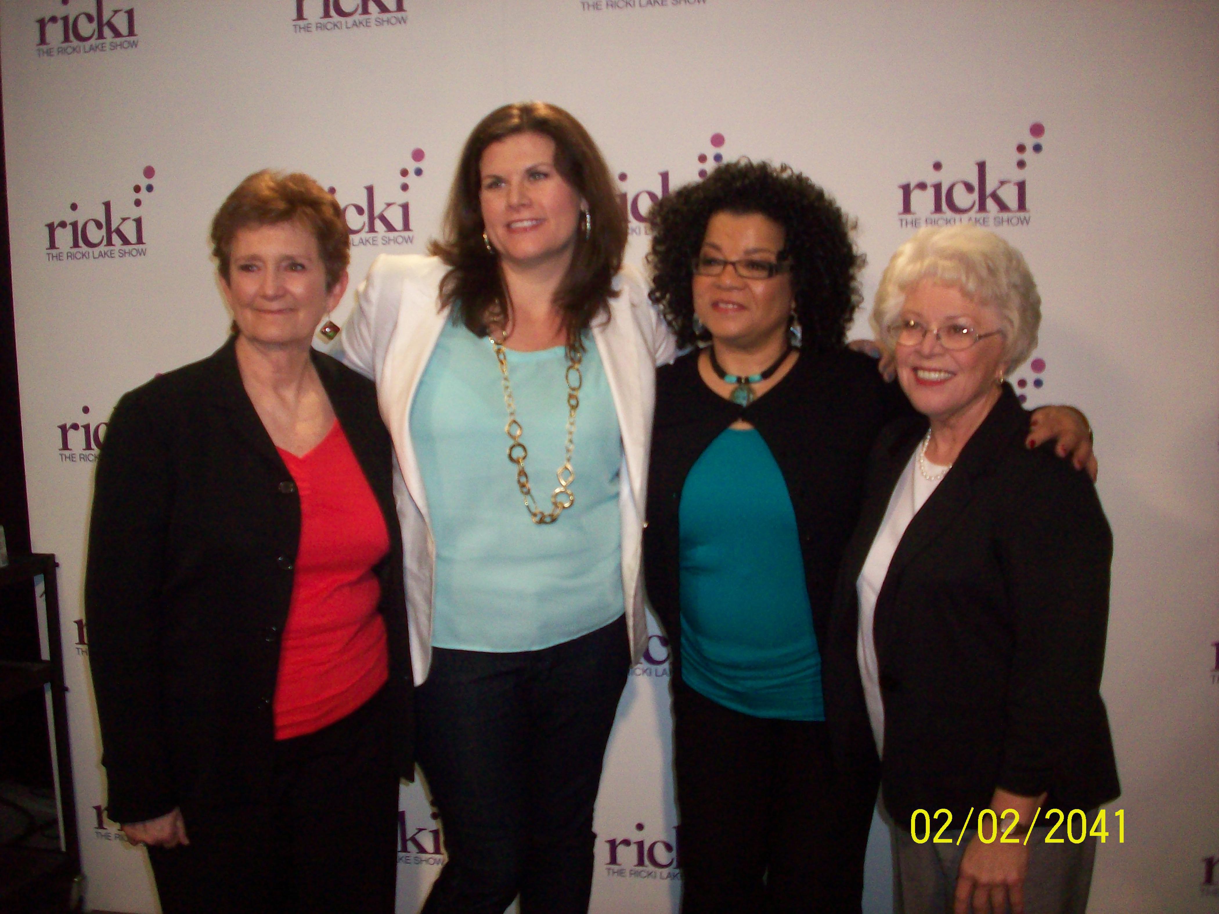 Laura Johnston Kohl, Ricki Lake, Leslie Wagner-Wilson, and an unknown woman pose for a photo on the Ricki Lake Show (L to R)