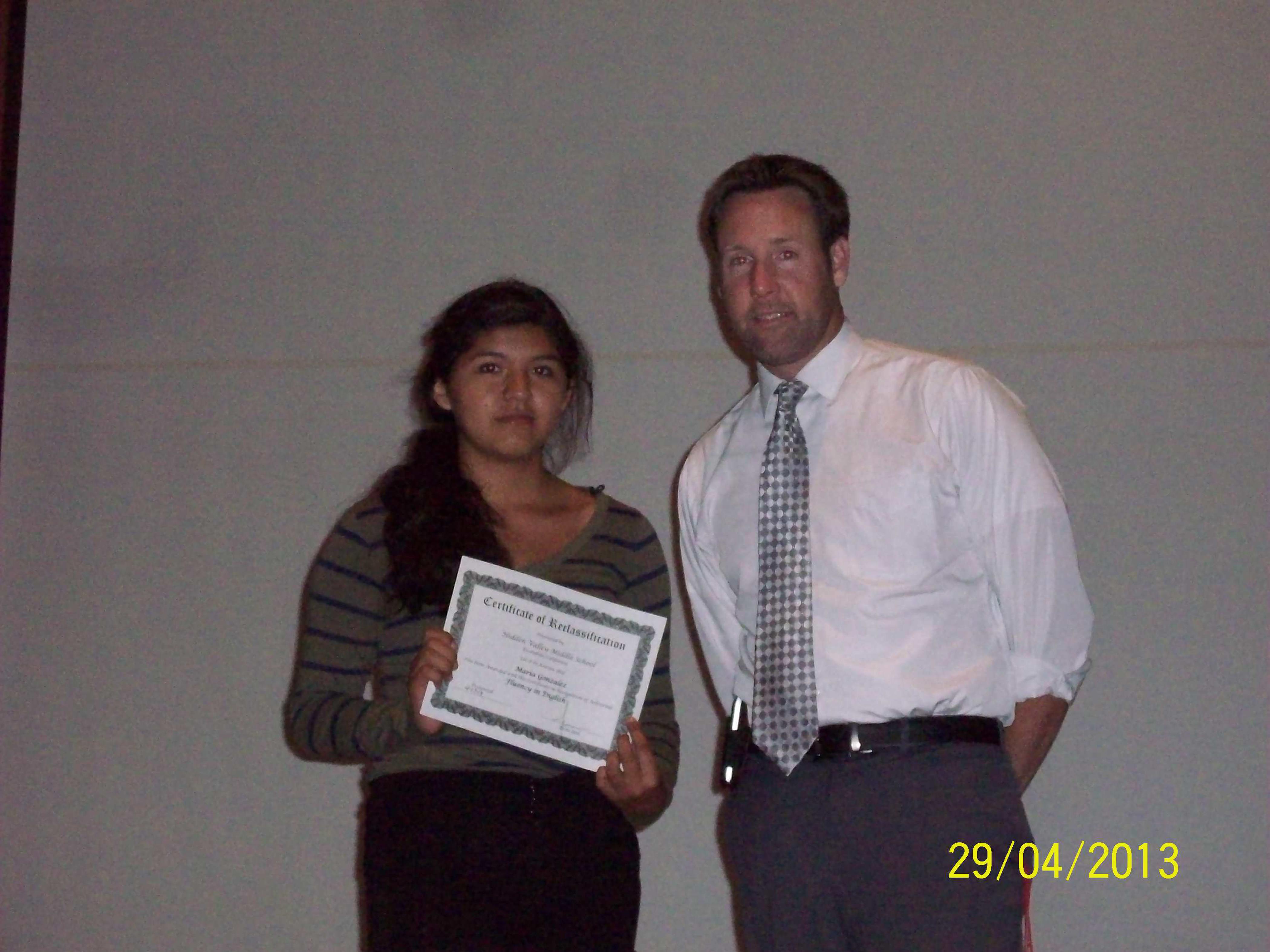 A girl poses with her award for her fluency in English from Hidden Valley Middle School.