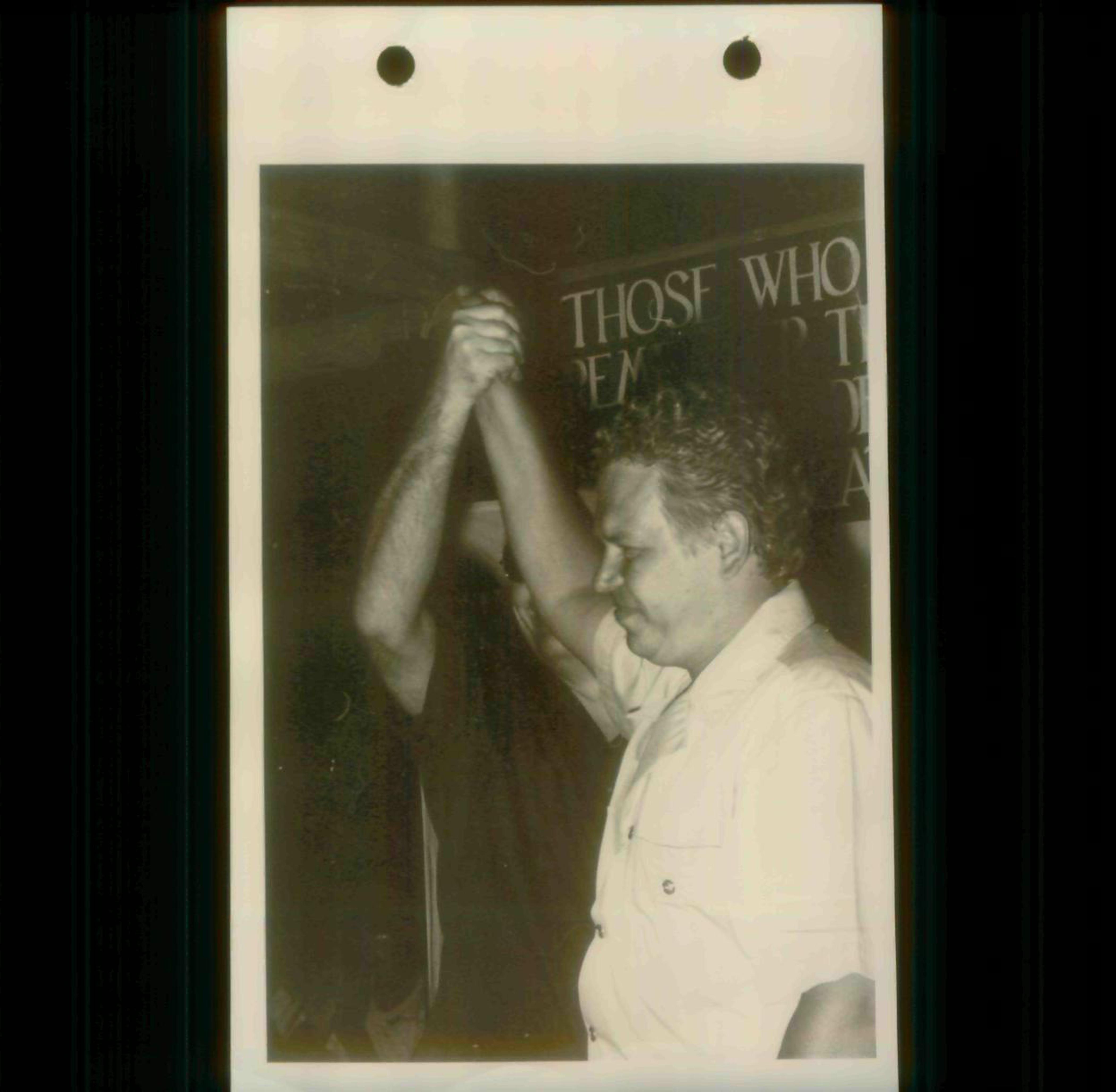 Jim Jones holds up the hand of another man in a triumphant handshake on a stage in Jonestown.