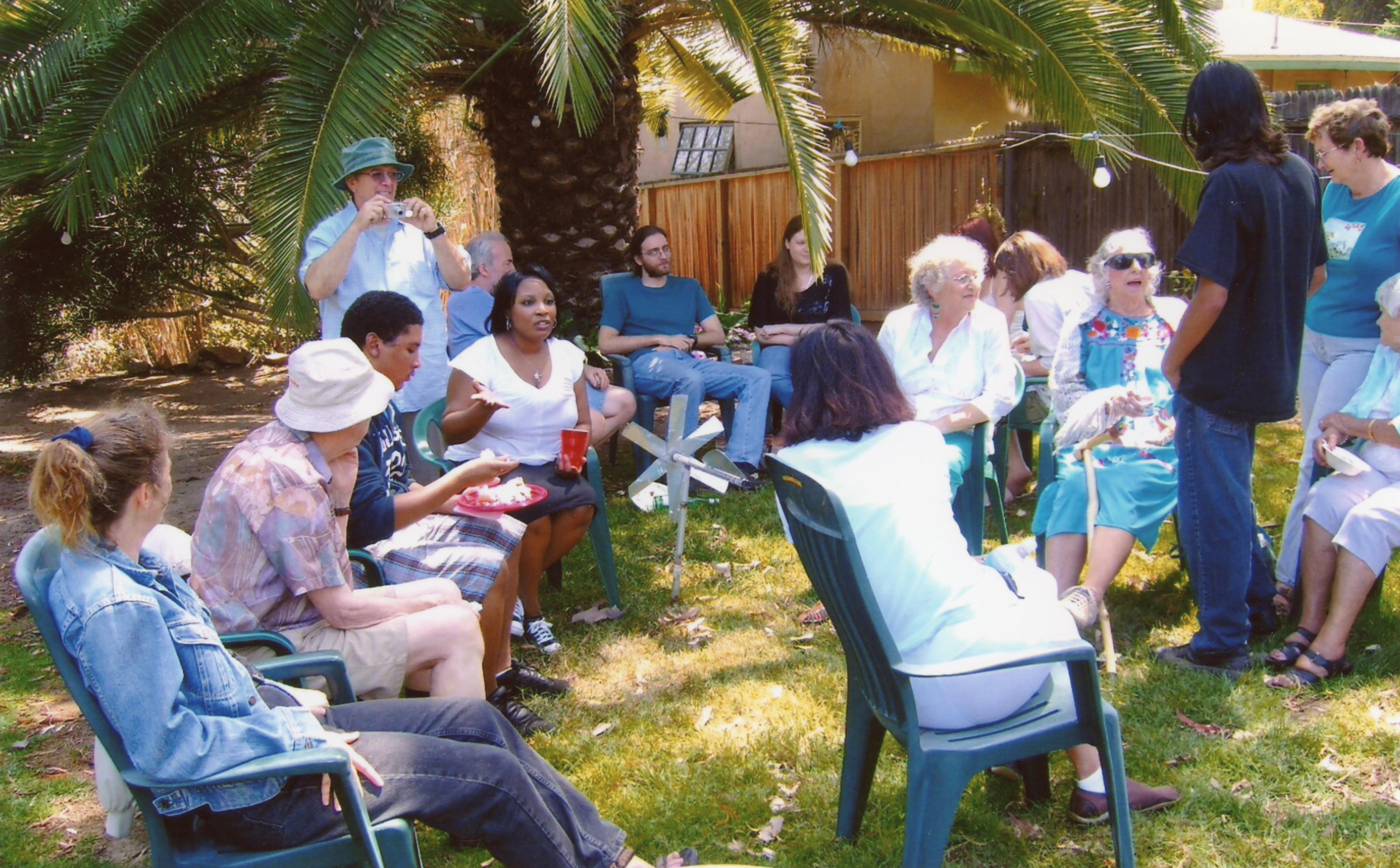 A group of people sit outside and pose for pictures at a reunion event. Among those sitting are Rebecca Moore( far left) and Grace Stoen (in the middle foreground), and Ron Kohl, Raul Kohl, and Laura Johnston Kohl all standing.