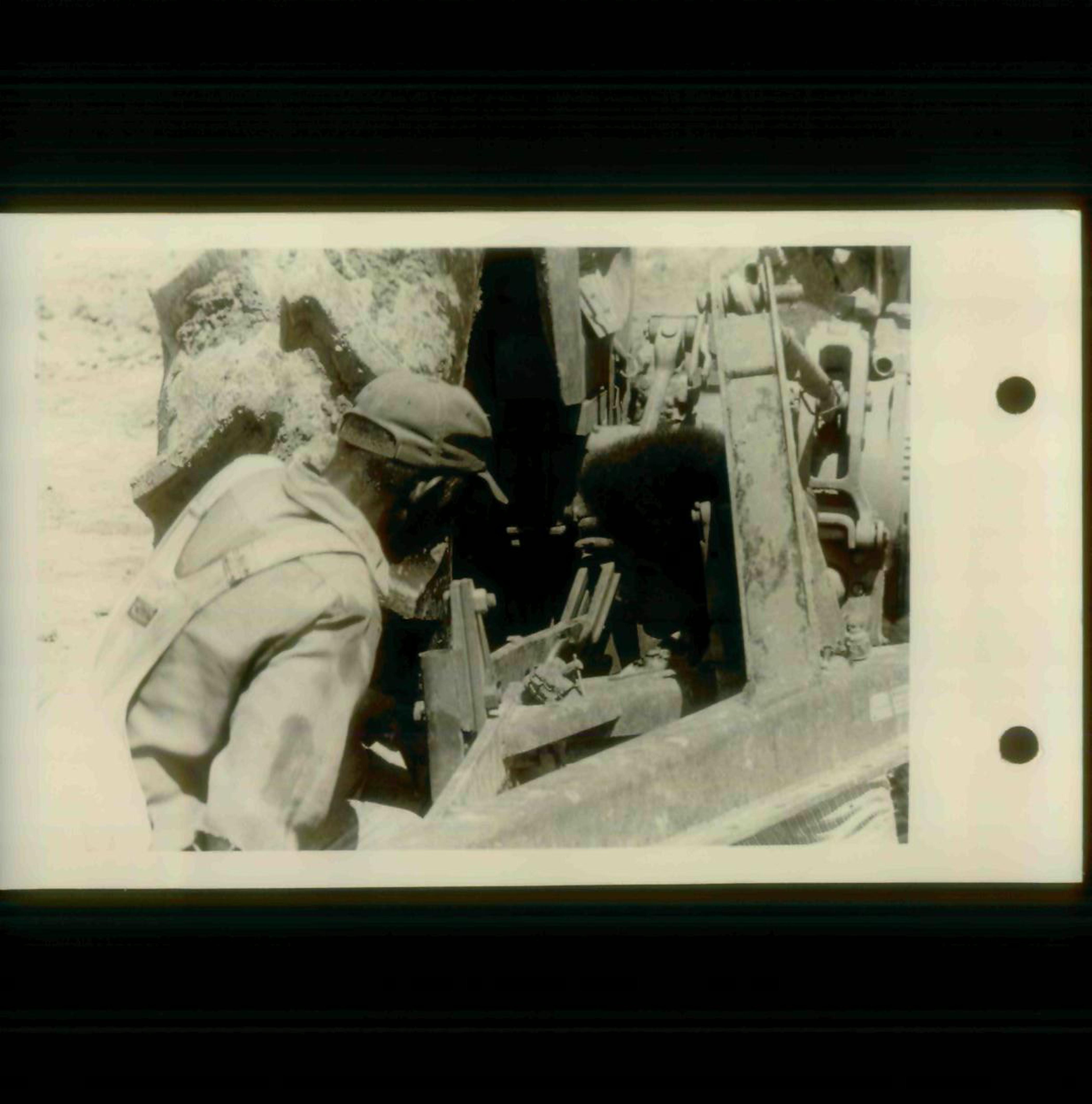 A worker with a cap on tends to a machine in disrepair outside in Jonestown.