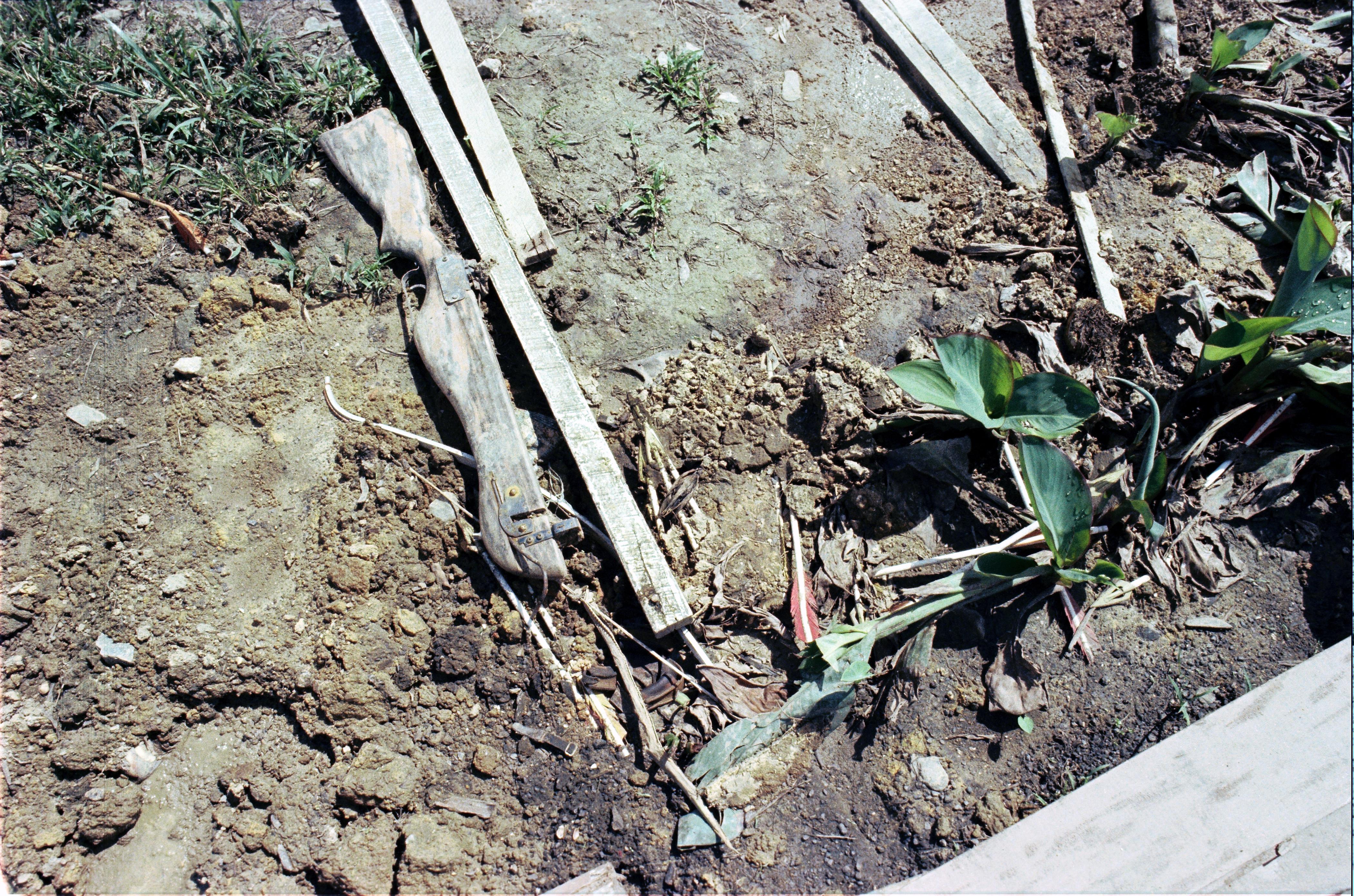 Crossbow and broken arrow left behind in the dirt after the tragedy at Jonestown.